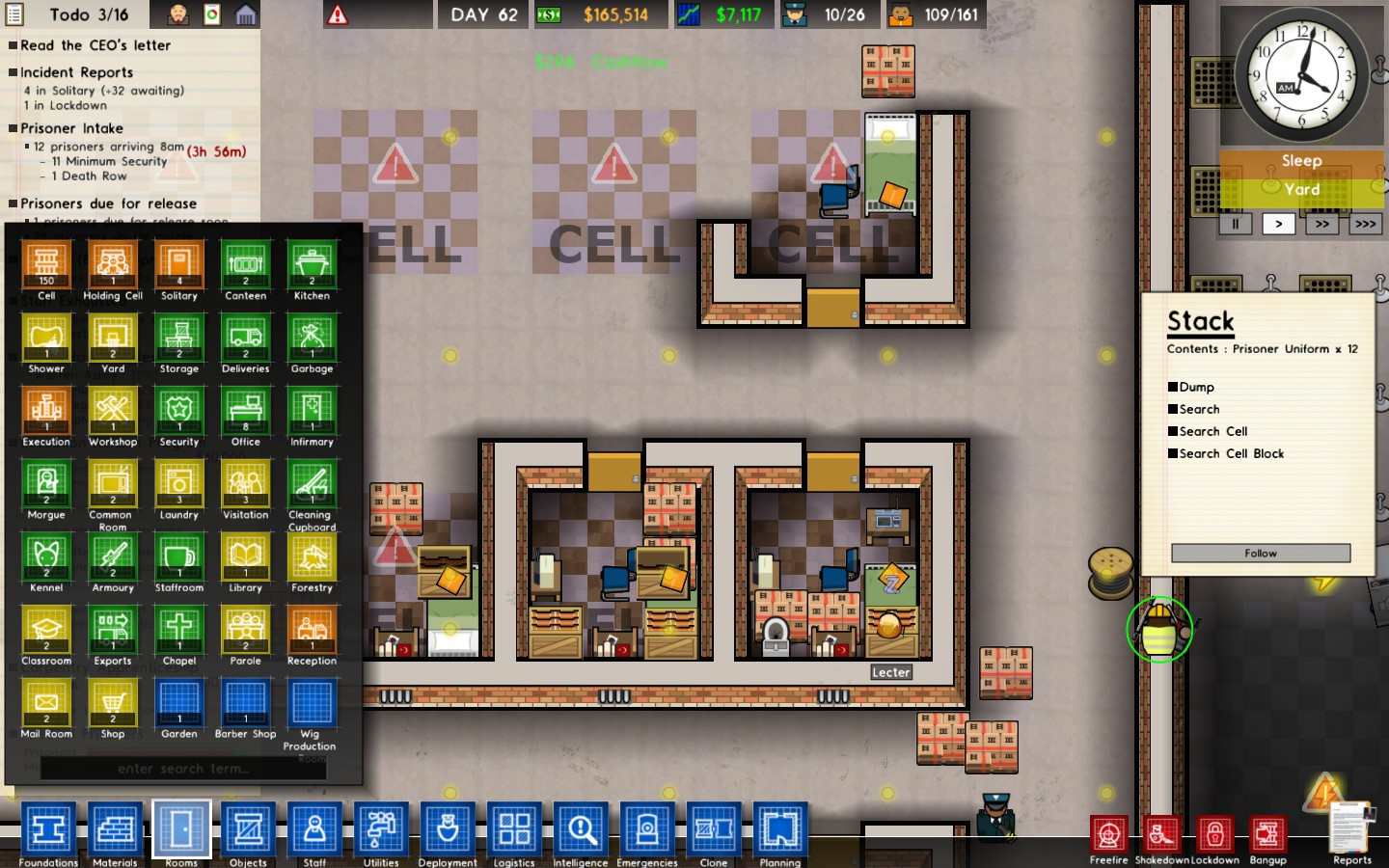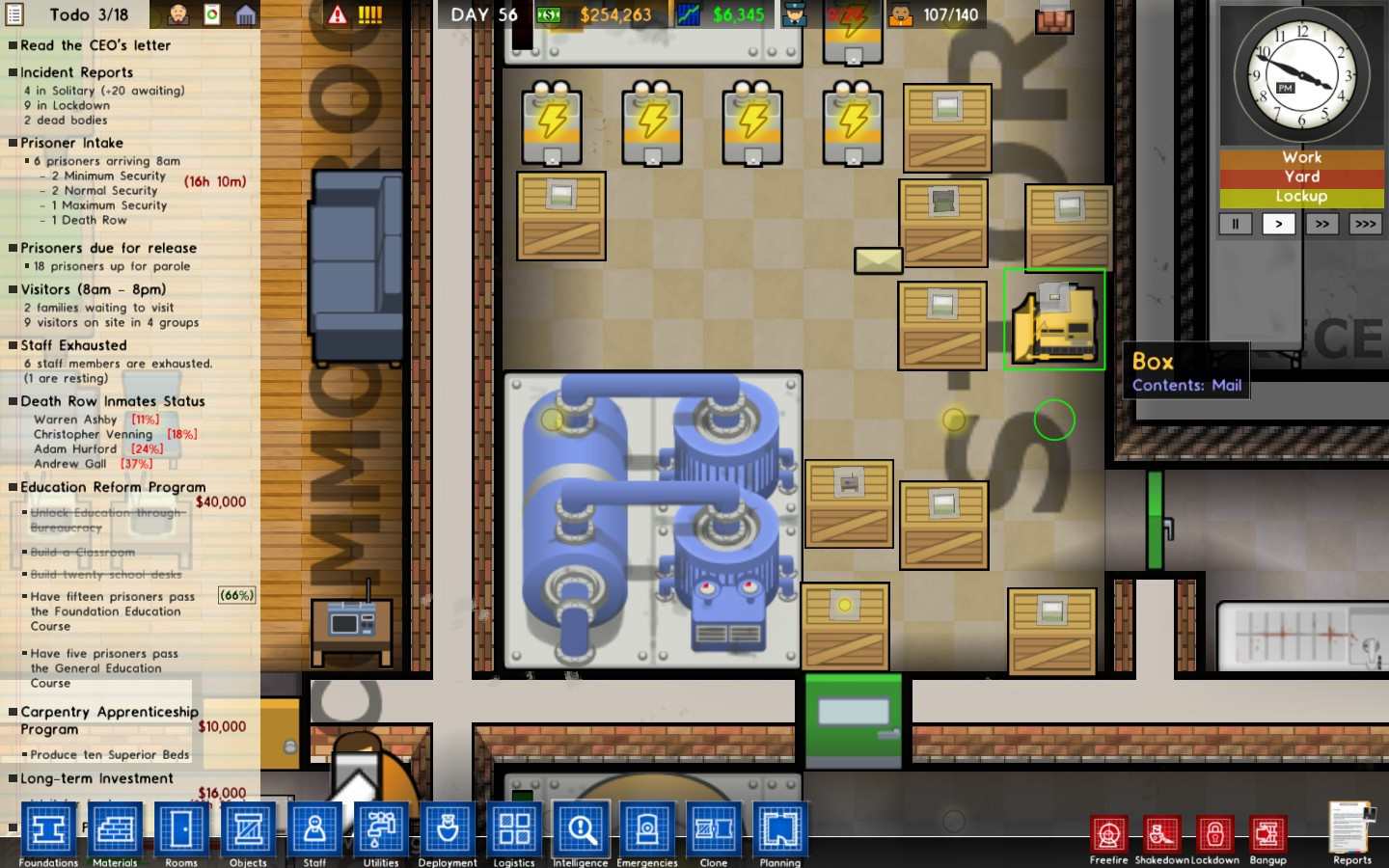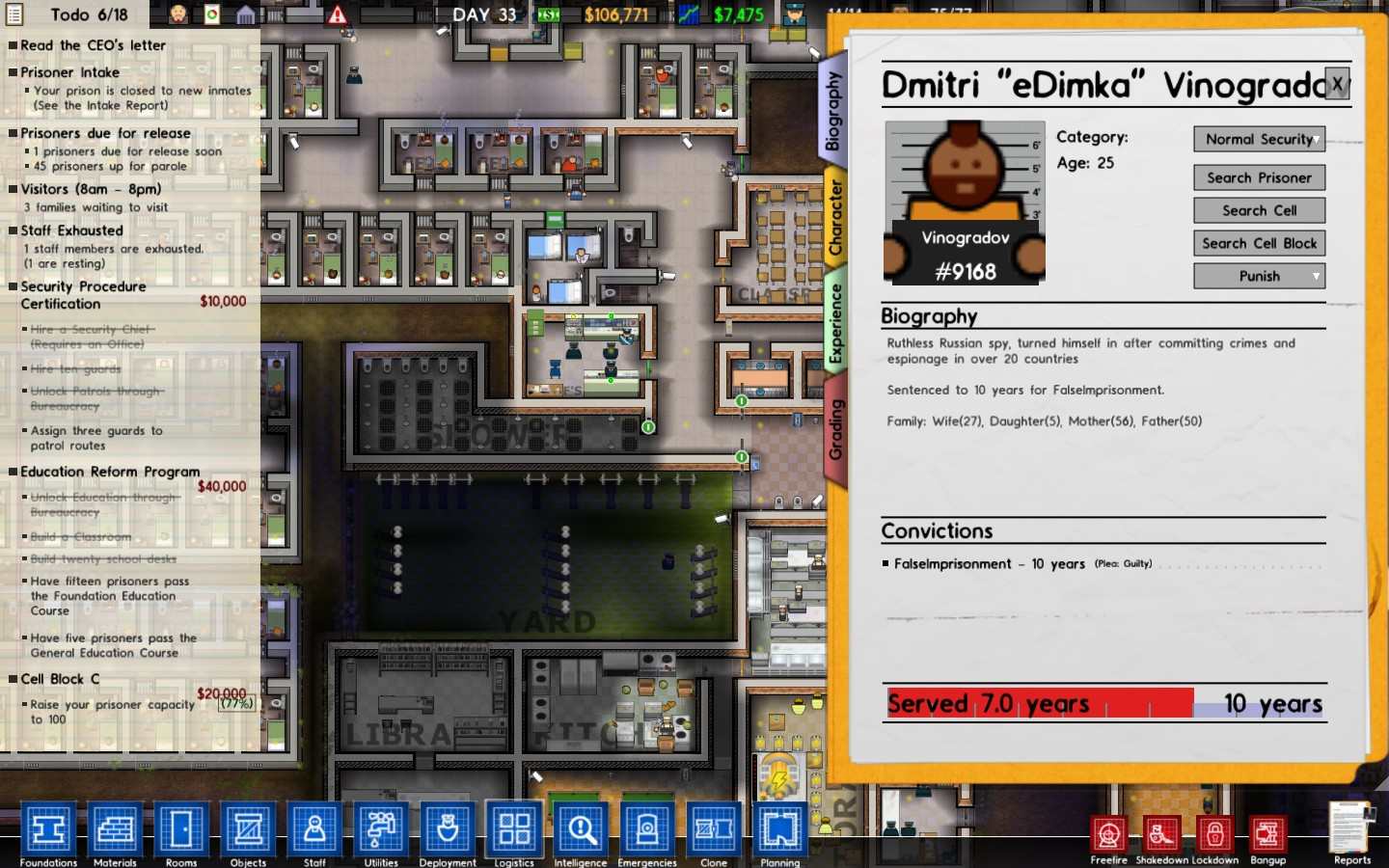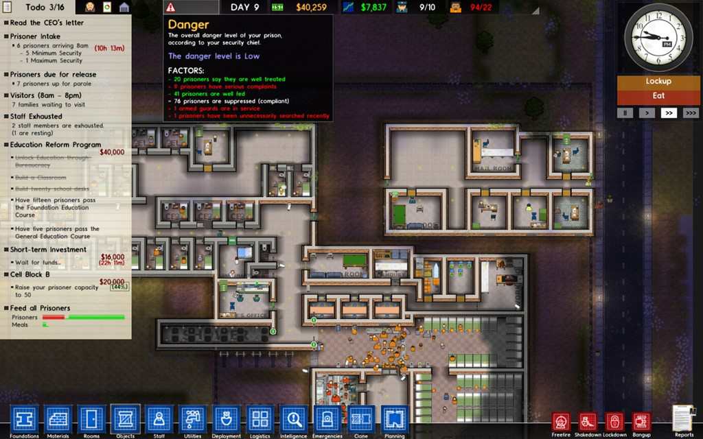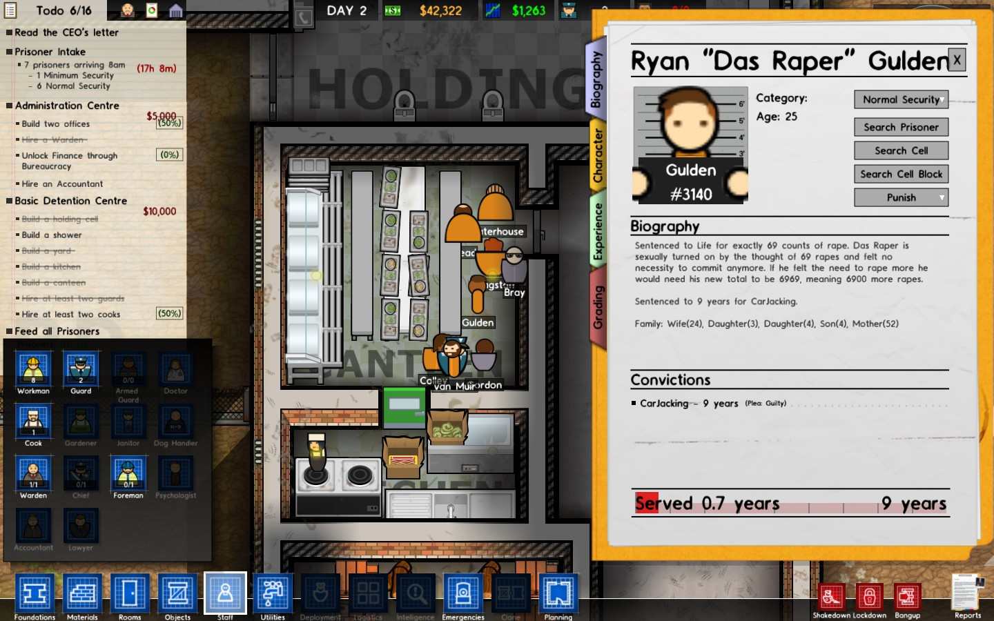 Крім, безпосередньо, планування самої площі в’язниці Ви маєте ряд інших екранчиків і віконець. Але не поспішайте лякатися – ви в них навряд чи заблукаєте. Річ у тім, що відкриваються вони всі тільки протягом найму спеціальних працівників і відкриття нових можливостей шляхом дослідження (прокачування) того, чим ці працівники займаються. А вибір широкий – бухгалтер може збільшити кількість грантів, на які ви можете претендувати, бригадир відкриває доступ до деяких видів працівників і робіт, юрист, за певну плату, допоможе якщо у вас виникнуть серйозні неприємності, а ще (для особливо безсердечних геймерів) відкриє можливість створювати камери без ліміту за мінімальної площі (ліжко з унітазом влізли? – ну і “добре”). У результаті у вас відкриється доступ і до можливості регулювати раціон, і до можливості планувати патрулі, і до можливості не тільки встановлювати камери спостереження, але і прослуховувати телефони, і навіть наймати стукачів. Як я вже сказав, все можна відкривати і освоювати по черзі, а ось вже більш досвідчені архітектори, зможуть досить швидко найняти всіх фахівців відразу і швидко відкривати всі ці можливості, що робить кожен старт не таким вже й нудним і суттєво так підвищує реплеябіліті.