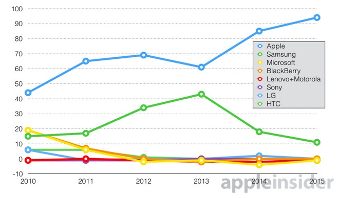 За даними аналітиків фірми Canaccord Genuity, переважна більшість доходів на ринку смартфонів генерує Apple. Проте вона як і раніше залишається другим за величиною виробником смартфонів у світі виходячи з сукупних продажів, поступаючись першим місцем південнокорейській компанії Samsung. На частку останньої припадає 11% від загального операційного доходу. Сукупний прибуток Apple і Samsung перевищує 100%, оскільки більшість інших виробників смартфонів зафіксували негативний операційний дохід. Зокрема, збитки понесли HTC, BlackBerry, Sony і Lenovo, що, на думку аналітиків, пов’язано з їх нездатністю конкурувати в сегменті смартфонів вартістю вище $ 400.