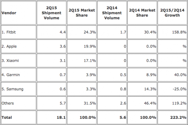 У другій календарній чверті 2015 загальносвітові поставки комп’ютеризованих ґаджетів, призначених для носіння на зап’ясті, склали 18,1 млн. одиниць, що на 223% більше показника річної давності. Розстановку сил серед виробників можна бачити на таблиці вище.