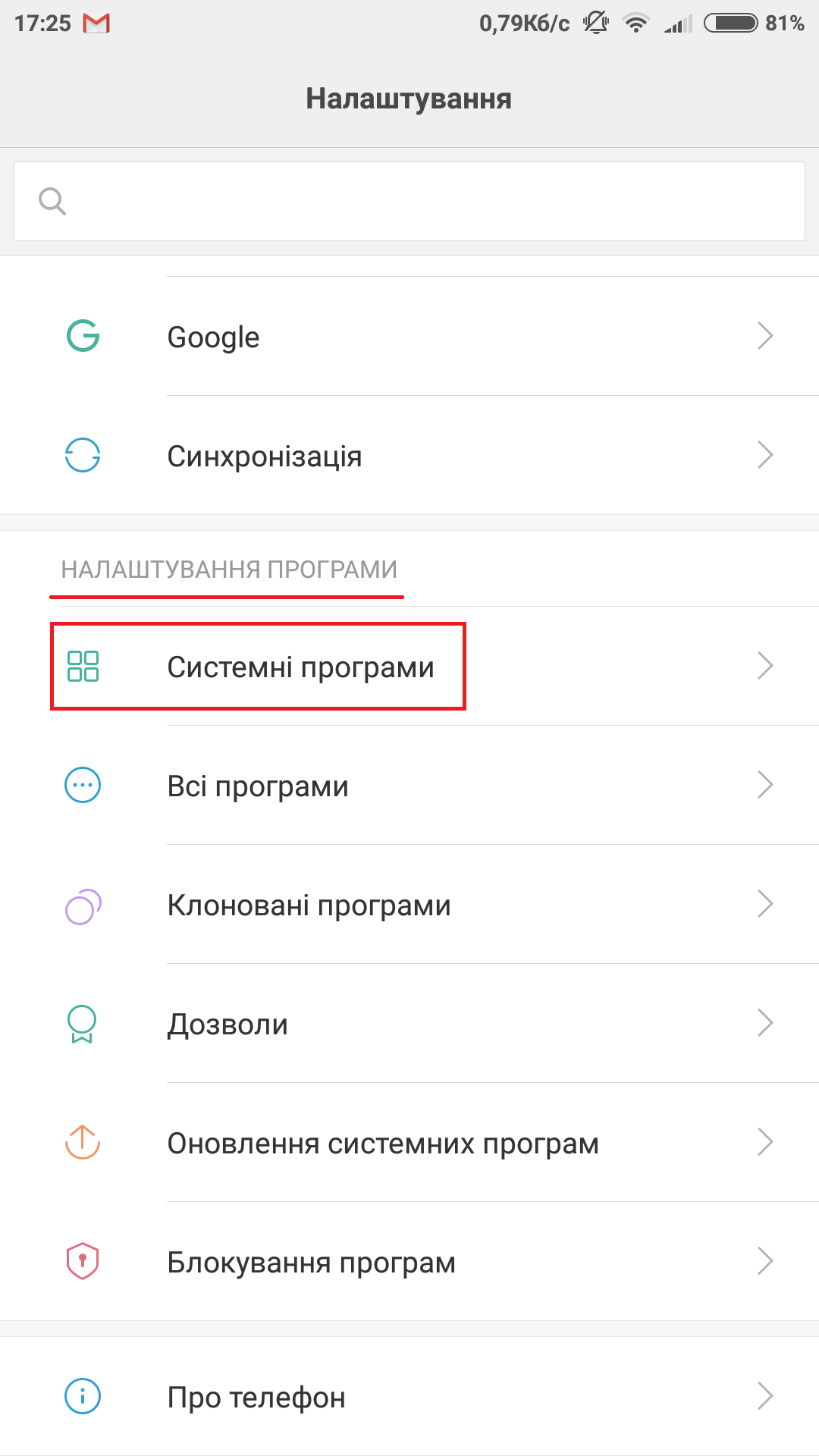 2. В самому низу є “Налаштування програми”, натисніть на “Системні програми”;