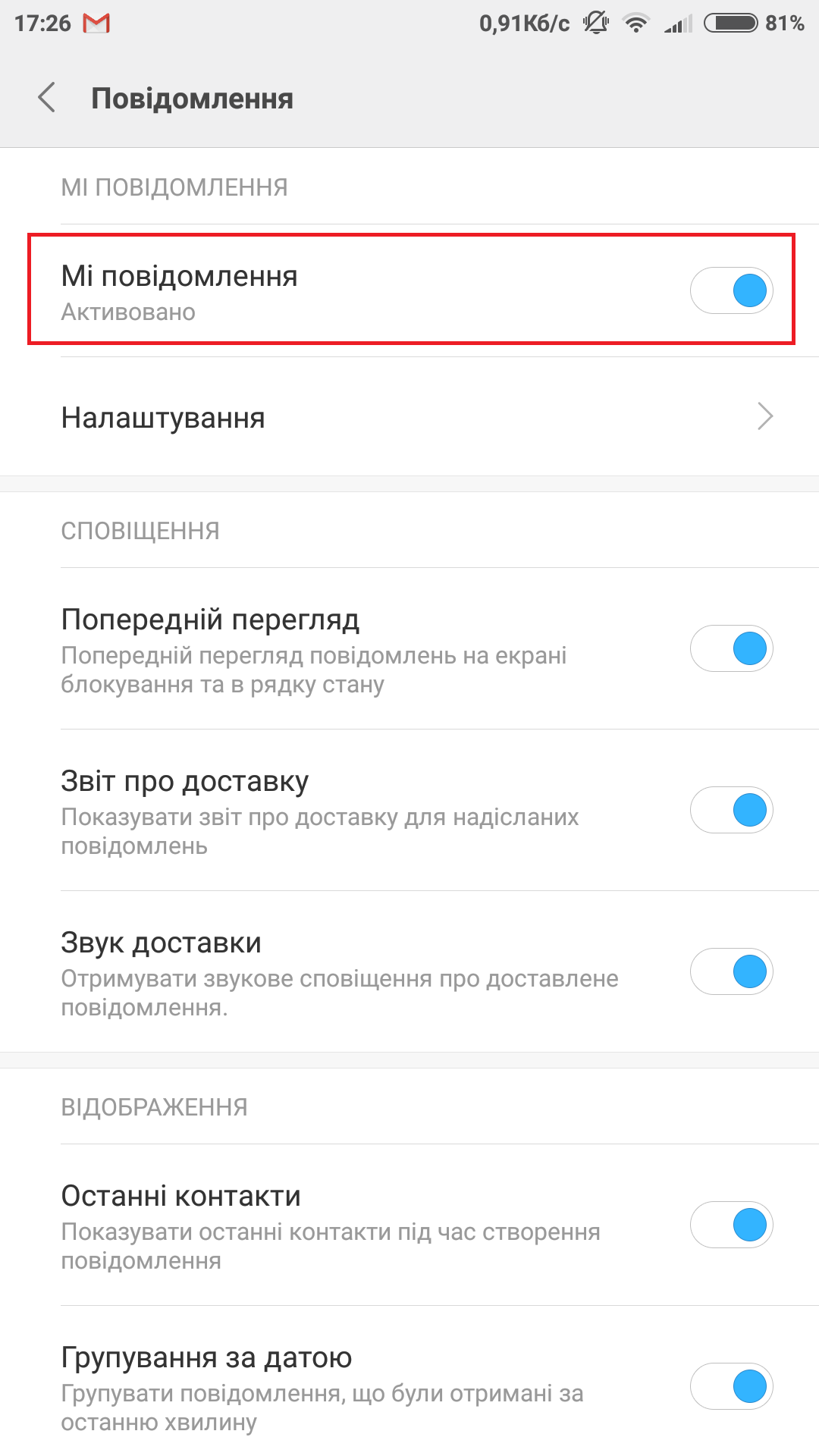 Також у вас є можливість зайти у налаштування «Mi-повідомлення». Тут у вас будуть такі можливості: