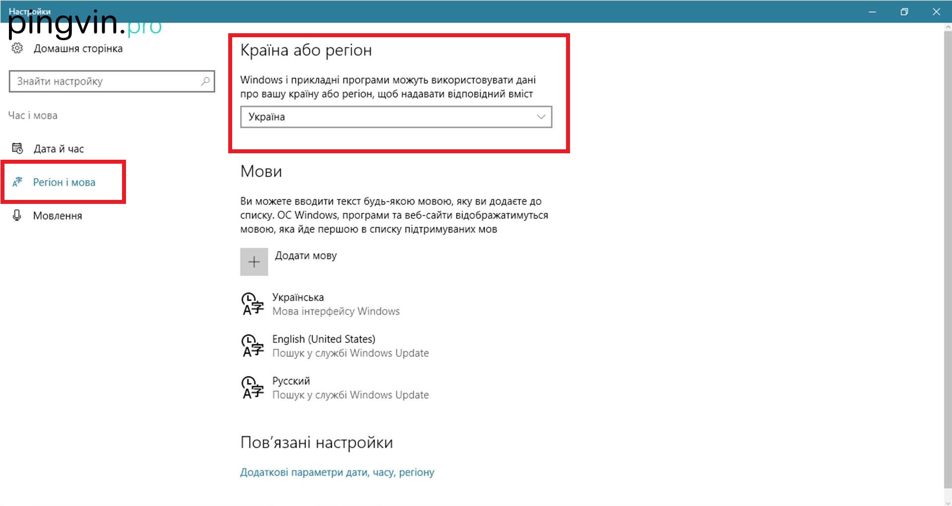 Однак, поділюся з вами одним секретом (а може для когось це не буде секретом…давно….), відкривши програму Настройки (дивно, чому досі не перейменували на Налаштування), яку можна знайти у Пуску або написати у рядку «Пошук у Windows», що біля Пуску, слово «Настройки». Після відкриття програми, переходимо у пункт «Час і мова», тоді з лівого боку «Регіон і мова», і тоді з правого боку, там де є «Країна або регіон» змінити із Україна на США. Піддивитися можна на картинки нижче.