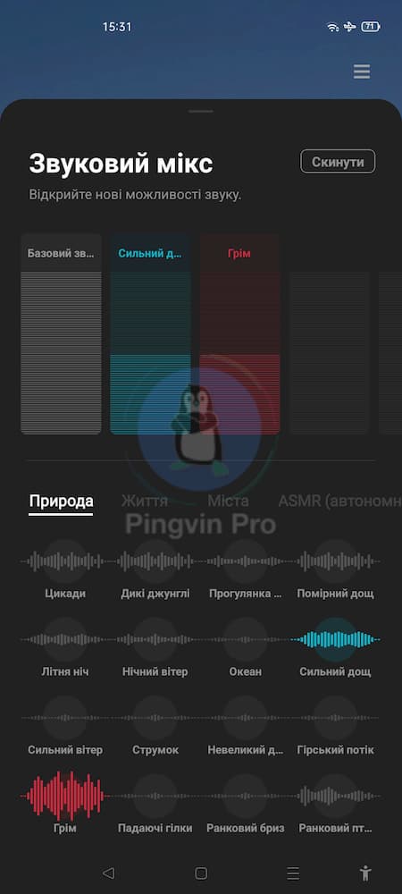 Звуки природи представлені 5 варіантами – це шум моря, ранкове сонце, нічний відпочинок на природі, загадковий космос та буддійський храм. Але тепер кожен з цих звуків ви можете «апґрейдити» за власними вподобаннями, використовуючи розділ «Звуковий мікс». Ви можете додати до 5 різних звуків, які відтворюватимуться разом з основним (базовим). Для зручності – вони розділені за категоріями: природа, життя, міста, ASMR та інше.