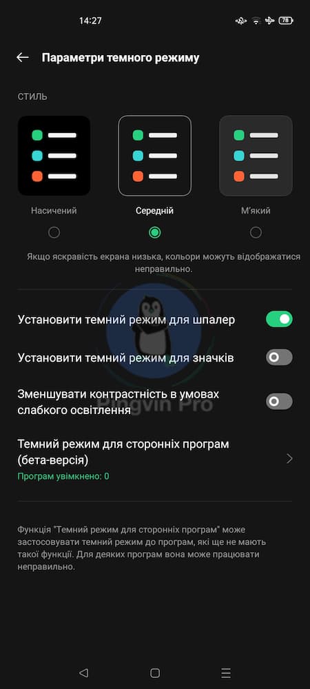 Темний режим полюбився багатьом користувачам ґаджетів і в ColorOS 11 він також отримав зміни. Тепер ви можете виставити його відповідно до сходу/заходу сонця. Або використовувати один з доступних стилей – посилений, середній чи лагідний. Шпалери та іконки можна також перемикати на темний режим, але вони не стають чорними – білий фон стає сірішим. Контрастність дисплея можна регулювати в залежності від навколишнього освітлення.