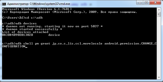 6. Як тільки отримали позитивний результат, вводимо команду adb shell pm grant jp.co.c_lis.ccl.morelocale android.permission.CHANGE_CONFIGURATION