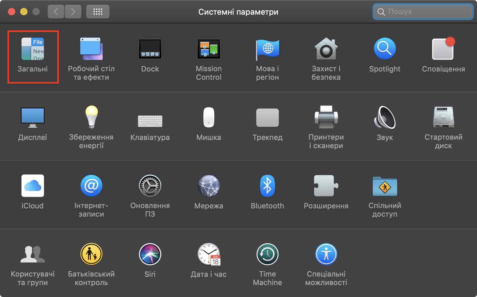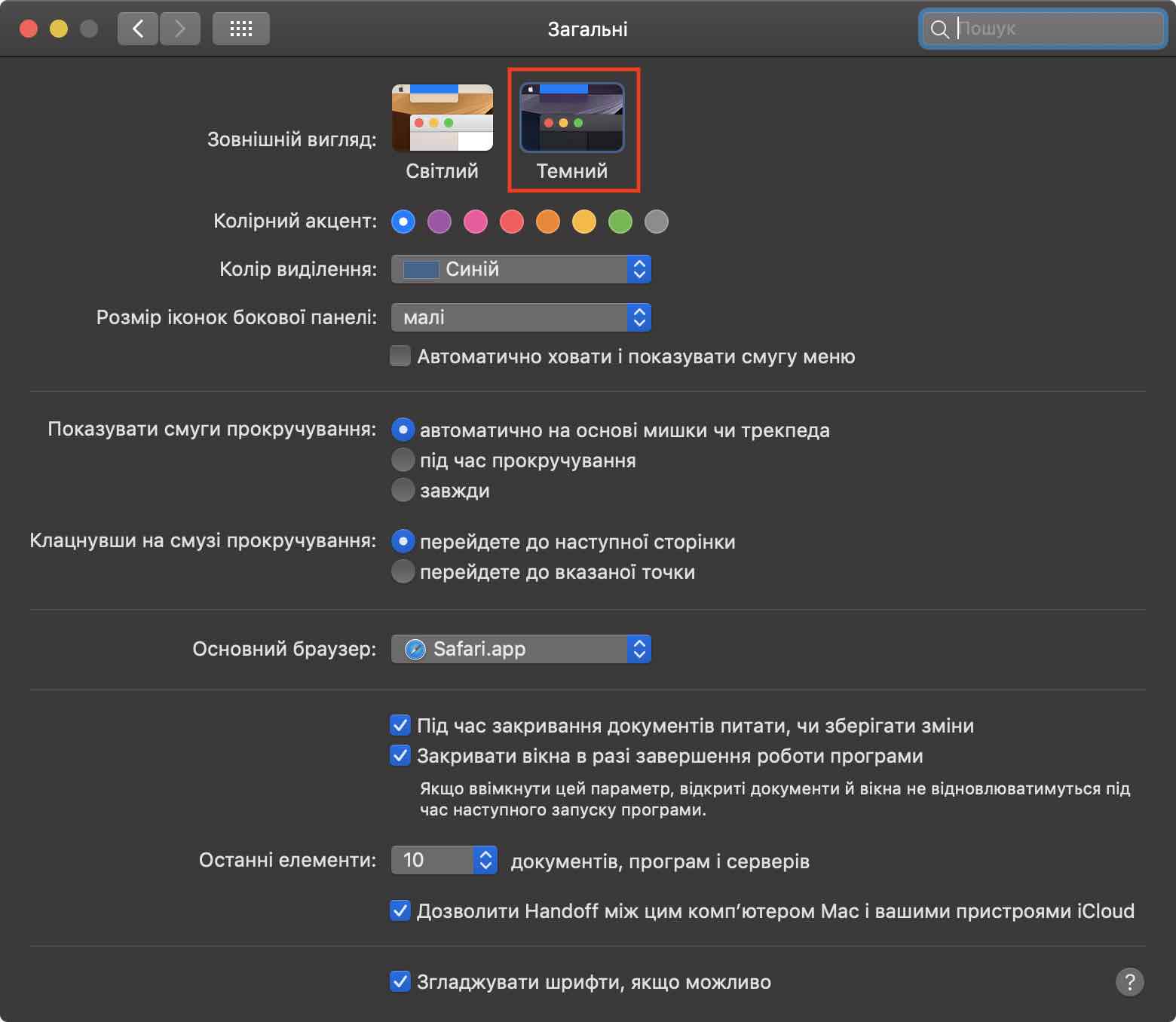 - Обрати пункт «Загальні» => «Зовнішній вигляд» => і обрати темну тему. Також, в будь-якій темі можна змінити колірний акцент.