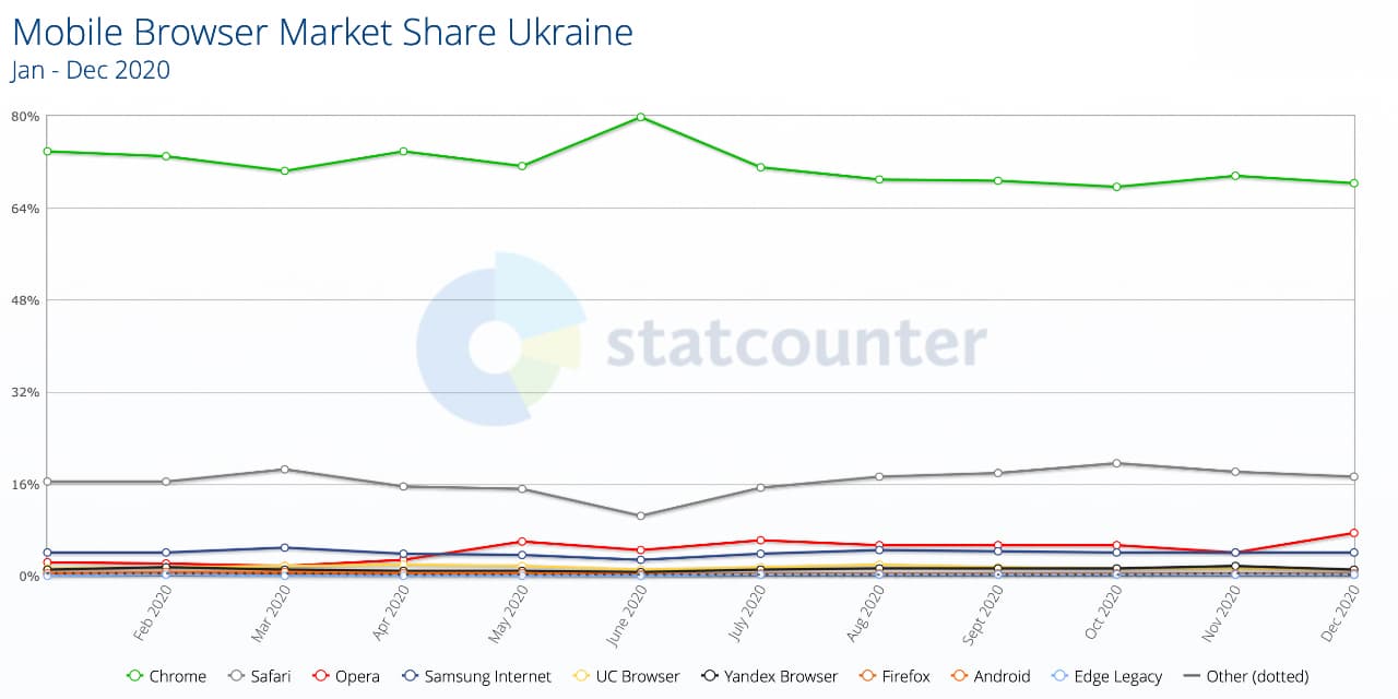 Microsoft Edge на Chromium, який офіційно запустили у січні 2020 року, теж опинився у цьому списку. У лютому його показник становив всього 0.09%. Приріст, насправді, був дуже маленький. Саме тому Microsoft так активно змушувала ним користуватися його просувала. Для України це не дало великого результату, адже наприкінці року показник зріс всього до 1.05%.