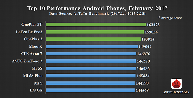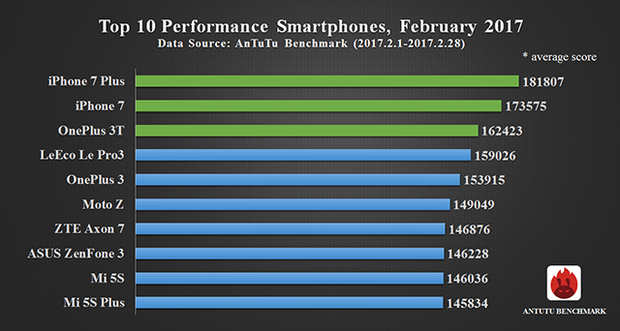 Друга позиція дісталася iPhone 7. Закрив трійку лідерів OnePlus 3T, повідомляє сайт розробників. Примітно, що перша трійка найпродуктивніших ґаджетів збігається з підсумковим рейтингом за 2016 рік. На четвертому рядку списку розташувався LeEco Le Pro 3. П’яте місце в рейтингу зайняв OnePlus 3. Шоста позиція дісталася Motorola Moto Z. На сьомому рядку розташувався ZTE Axon 7, на восьмий – Asus ZenFone 3. А нові флагмани Xiaomi – Mi5S і Mi5S Plus розділили дев’яту і десяту позиції. Розробники відзначають, що до рейтингу не потрапили дані китайського ринку.