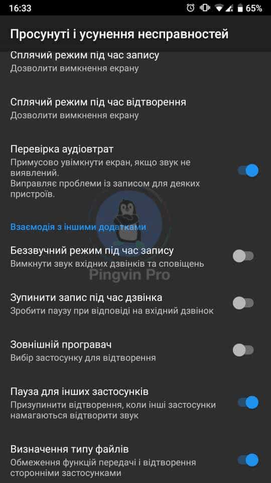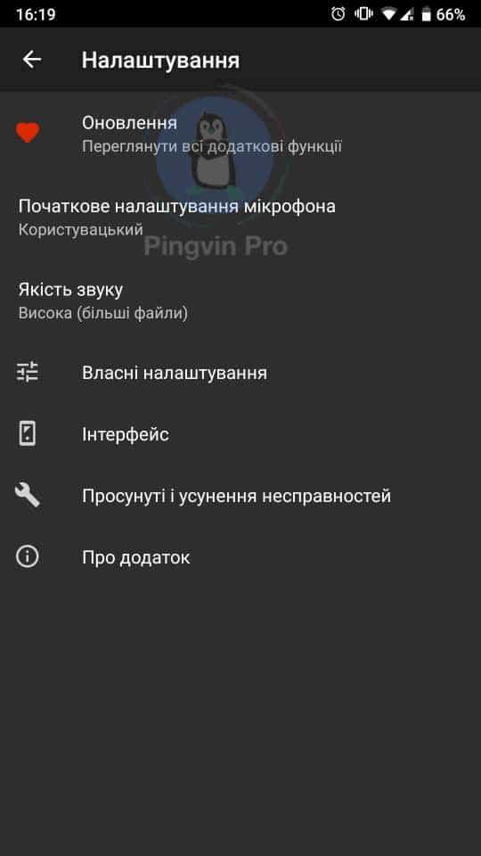 В меню ви можете налаштувати заглушення луни, понизити шум та дізнатися інформацію про запис. Можна налаштувати мікрофон в залежності від потреби – зустрічі і лекції, музика і необроблений звук чи голосові нотатки. Також виставити якість звуку – висока (більші файли), середня і низька (менші файли). У категорії «Власні налаштування» можна виставити найбільш відповідні показники – мікрофон, кодування, частота дискретизації.