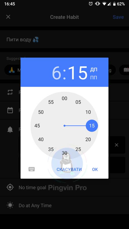 Ця програма ще потребує допрацювання, але це ніяк не заважає її функціональності та корисності. Цей мобільний додаток допомагає «дресирувати» ваші хороші і правильні звички. Наприклад, у мене постійно не знаходиться часу, щоб дочитати книжку. Я заходжу в програму і виставляє назву завдання «Читати книжку», обираю час сповіщення та інтервал нагадування. Таким чином ви можете налаштувати абсолютно будь-яке завдання, яке постійно відкладається через брак часу – спорт, медитація, відпочинок, прогулянка чи навіть прибирання тощо.