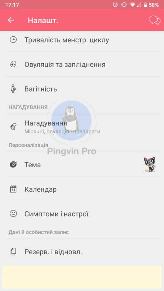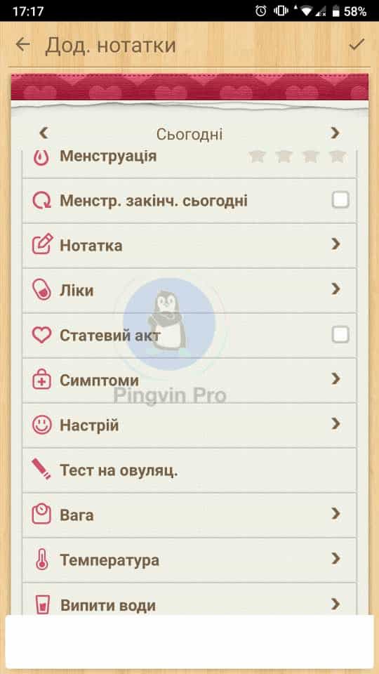 А тепер настала черга додатка тільки для жіночої половини читачів Pingvin Pro. Тому подальша інформація хлопцям не потрібна. Цією програмою я користуюся вже не один рік і сміливо можу її рекомендувати. Як ви здогадалися – це жіночий календар, в якому можна вести записи не лише циклу, а й щоденник вагітності. Також в програмі є форум, щоправда англійською, який розділений на різні категорії – про додаток, для дорослих, підлітків, життя жінок та вагітність.