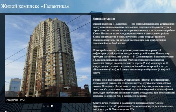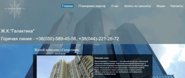 Зовсім інший вид має шахрайський веб-ресурс http:// info-galactika .com .ua, що імітує сайт ЖК «Галактика».