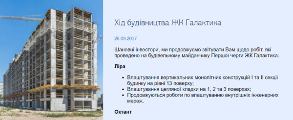 Українці знову стали отримувати смс про виграш квартир. На відміну від інших подібних прикладів, в цей раз аферисти вирішили використовувати ім’я реально існуючого житлового комплексу, який будується в Києві за адресою вул. Євгена Сверстюка, 4. Тут зводить багатоповерхівку компанія SG (Stolitsa Group). Житловий комплекс «Галактика» складається поки з двох будинків («Ліра» і «Октант»), рівень підготовки яких можна оцінити в наданому інвесторам звіті.