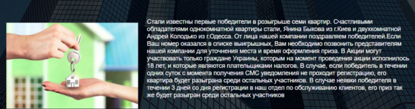 - Жодна компанія не буде розігрувати квартири «тихо» – під акцію такого масштабу створюється ціла рекламна компанія. Якщо ви раптом «перемогли» в акції, про яку немає ніякої інформації, про яку ви навіть не чули, участі в якій не приймали – це обман!