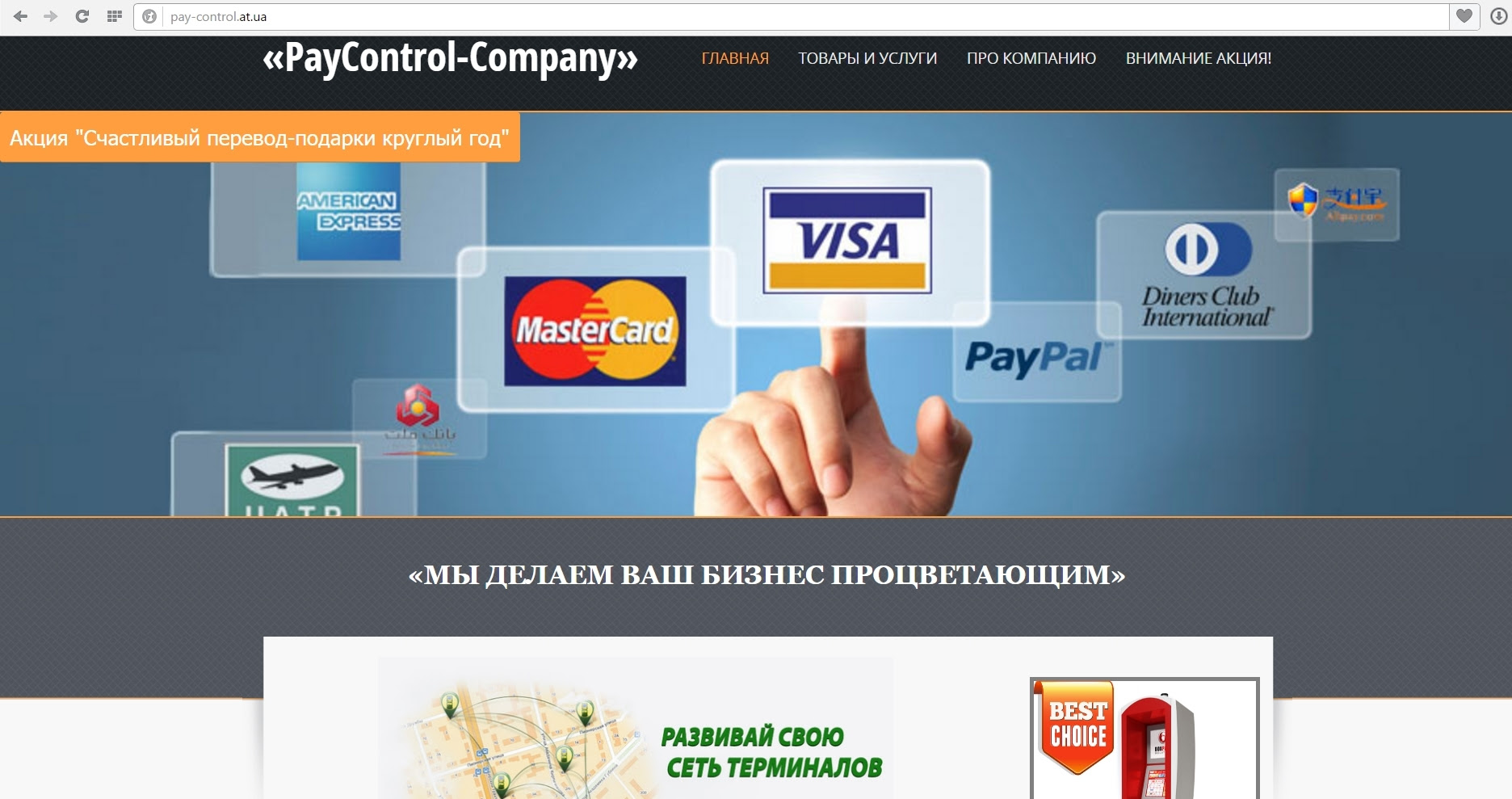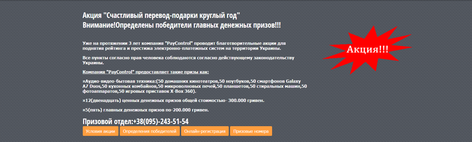 - Текст смс направляє на сайт «дізнатися подробиці», де багато і переконливо написано про акцію, але будь-які дії потрібно здійснювати «під наглядом» операторів гарячої лінії (в тому числі, переказ 1,7% вартості призу на вказаний операторами рахунок – через банкомат або термінал; швидше за все, користувача спробують заплутати і змусити внести велику суму (наприклад, говорять, що потрібно ввести код активації, а насправді, в зазначеному шахраями поле може вводитися сума переказу і т.п.));