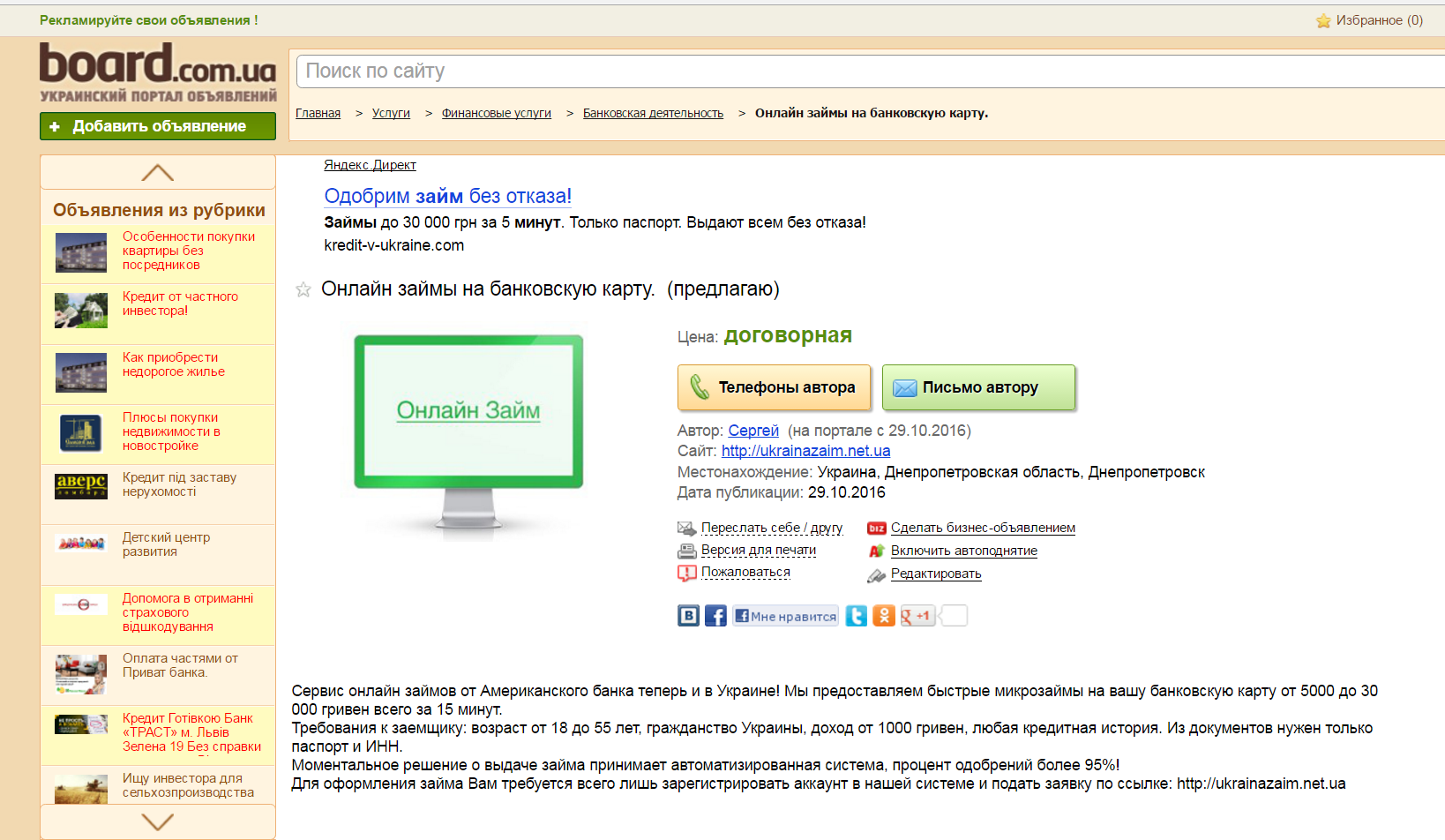 На сайтах безкоштовних оголошень в Інтернеті було виявлено дві реклами, які закликають взяти кредит у «американського банку». Там той же контактний номер телефону, а вказану адресу сайтуukrainazaim.net.ua переадресовує на той же http://morganbank.com.ua.