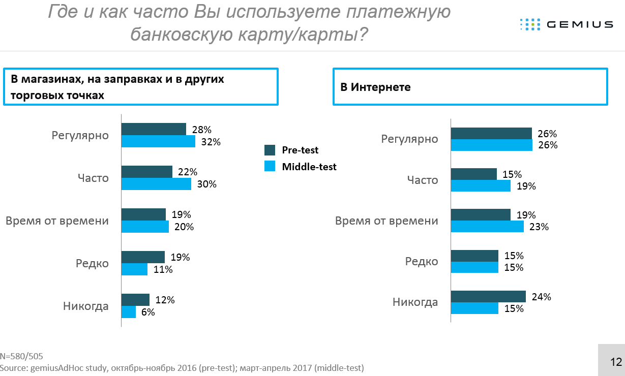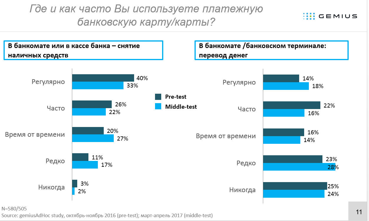 Тим часом, число респондентів, які рідко використовують банкомат / термінал для грошових переказів, зросла з 23% до 28%. Це може свідчити про зростаючу популярність онлайн-переказів на картку. Тобто, ті користувачі, які вважали за краще «передові» технології переказів (через термінал або банкомат, а не в касі банку або поштою) могли оцінити переваги переказів в Інтернет.
