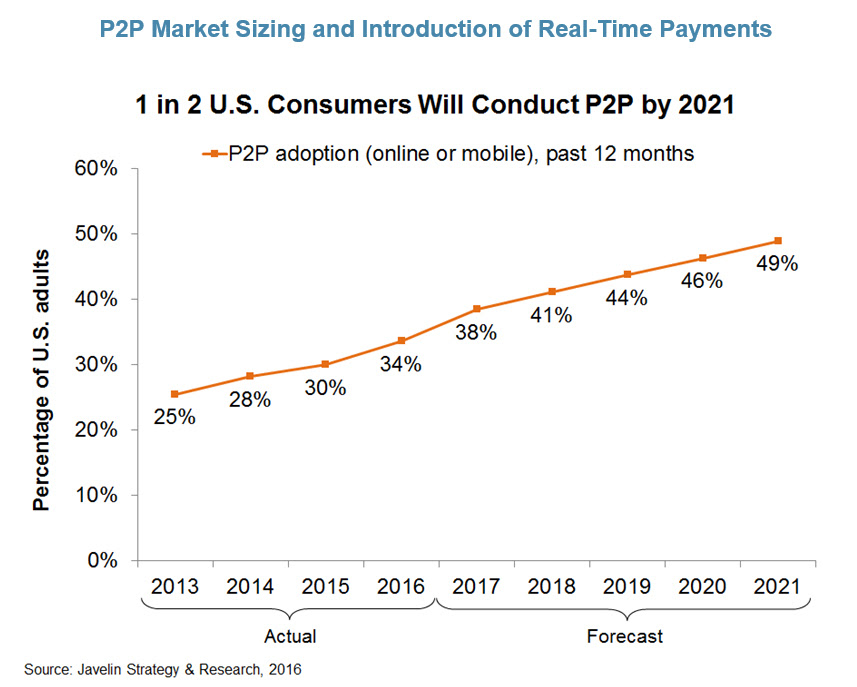Як змінюються обсяги P2P платежів можна простежити в наступному графіку, складеному американською компанією Javelin Strategy & Research в 2016 році (спираючись на дані по США). У 2016 році приріст склав 34%, а в 2017 році, згідно з прогнозами, він досягне 38%.