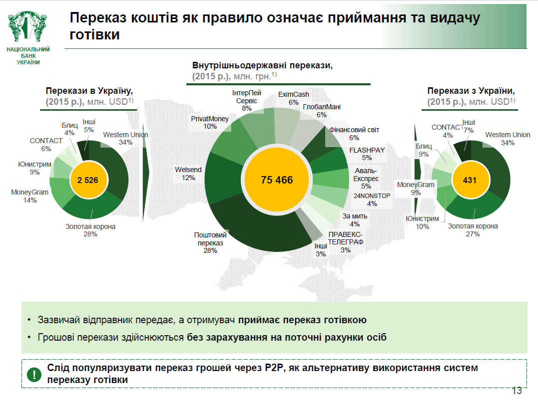 Згідно з даними НБУ (посилається на результати опитування, проведеного компанією GFK для Visa), 71% українців вважає за краще передавати готівку з рук в руки. Якщо такої можливості немає, то 37% респондентів відправляться робити переказ готівки через банківський термінал, 16% зроблять переказ готівки через касу банку. У той же час, 50% опитаних підтвердили, що здійснюють онлайн-перекази грошових коштів по системі р2р.
