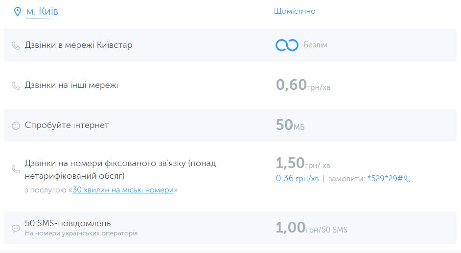 Ну і Київстар. На офіційному сайті, у розділі «тарифи для спілкування» всього два варіанти, і обидва передбачають абонплату. Що ж, розглянемо дешевший, 35 грн в місяць тарифний план «Для дзвінків». За ці гроші, ми отримаємо Безлім у мережі, 60 копійок за хвилину на номера інших операторів, 50 Мб інтернету, та 50 смс на будь-які номера по україні. Доречі якщо використали всі смс-ки, то далі платите 1 гривню за додаткових 10 смс.