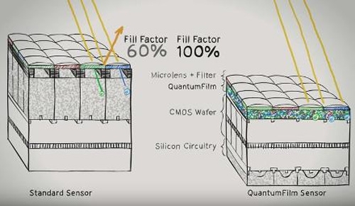 Чутливий елемент датчиків нового типу являє собою полімерну плівку товщиною всього 0,5 мкм з вкрапленнями халькогенидів металів з II-VI груп таблиці Менделєєва, які поглинають світло в дуже широкому спектрі і забезпечують камері більш динамічний діапазон. А оскільки цей шар розташований на невеликій глибині, сенсор здатний сприймати потоки променів, падаючих під великим кутом: загалом автори технології говорять про коефіцієнт поглинання аж до 100% проти 60% у КМОП-датчиків, притому що останні мають великі габарити.