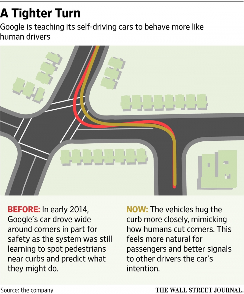 За словами керівника проекту з розробки безпілотних автомобілів Кріса Урмсона (Chris Urmson), самокеровані автомобілі «трохи більш обережні, ніж повинні бути», тому зараз їх навчають більш «людському» водінню – зрізати кути при повороті, перетинати подвійну жовту лінію, об’їжджаючи припарковані другим рядом автомобілі, «втискуватися» в перехрестя і просуватися вперед коли поруч знак «4-way stop» (рух без зупинки заборонено), даючи зрозуміти іншим водіям, що має намір продовжити рух.