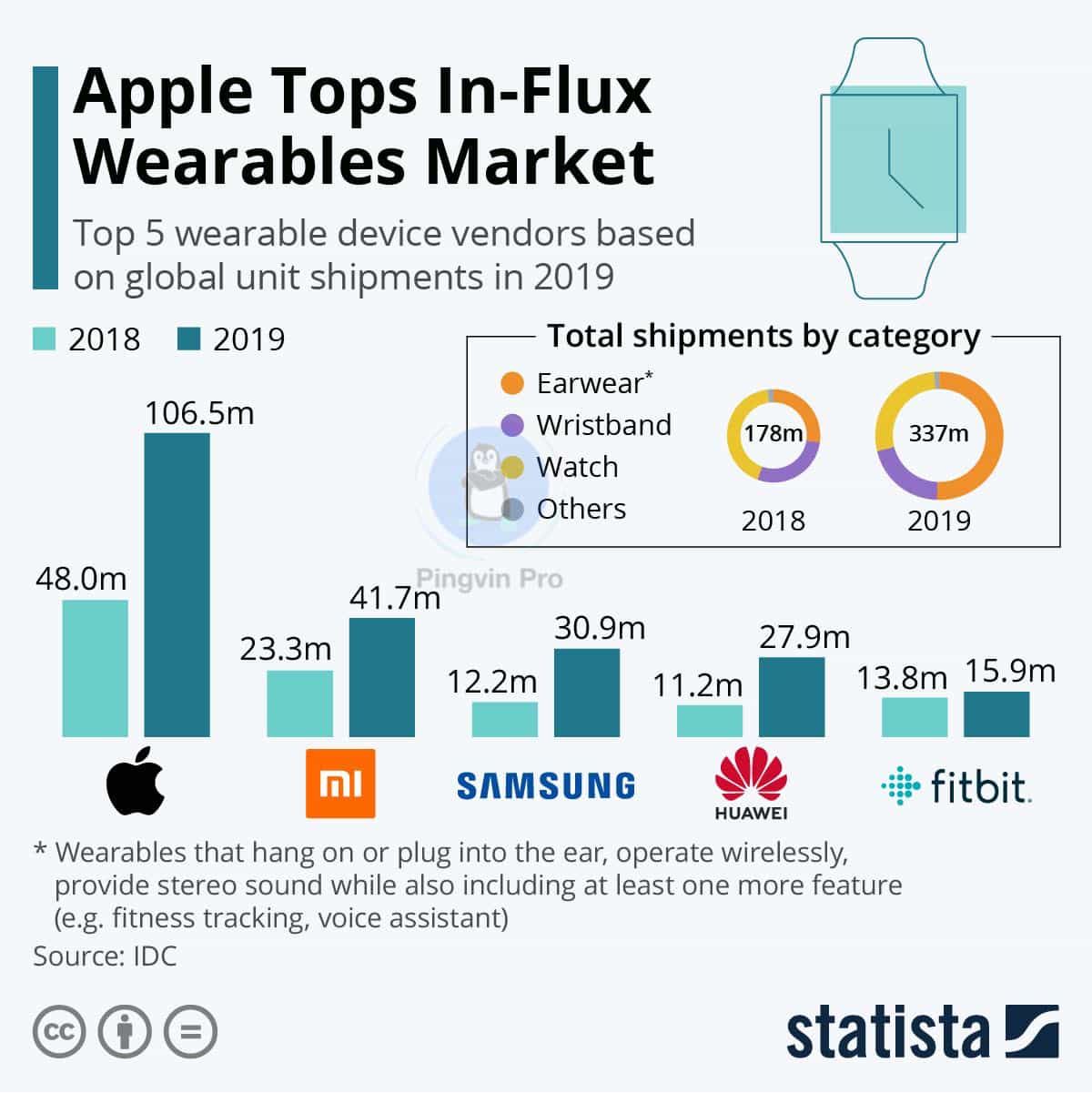 Ринок носимих пристроїв виріс зі 178 млн відвантажених пристроїв у 2018 році до 337 млн одиниць у 2019 році. Зараз ринок носимих пристроїв постійно змінюється, оскільки поява інтелектуальних бездротових навушників змінило «обличчя галузі». Згідно з інфографікою, ще у 2018 році найбільшою нішою носимої електроніки були розумні годинники. Але вже за рік ситуація кардинально змінилася – у лідерах бездротові навушники, годинники змістилися на другий план. Apple та Xiaomi мають перші місця – електроніка від Apple найпопулярніша, а від Xiaomi – найдешевша.
