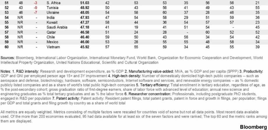 Відомий ресурс Bloomberg склав рейтинг найбільш інноваційних економік світу – Bloomberg Innovation Index. На першому етапі оцінювалося понад 200 країн світу. Вони отримували бали від 0 до 100 в кожній з семи категорій. Зокрема, концентрація дослідників та вчених, кількість високотехнологічних компаній та патентна активність. Згідно з отриманими даними, список було скорочено до 60 країн.