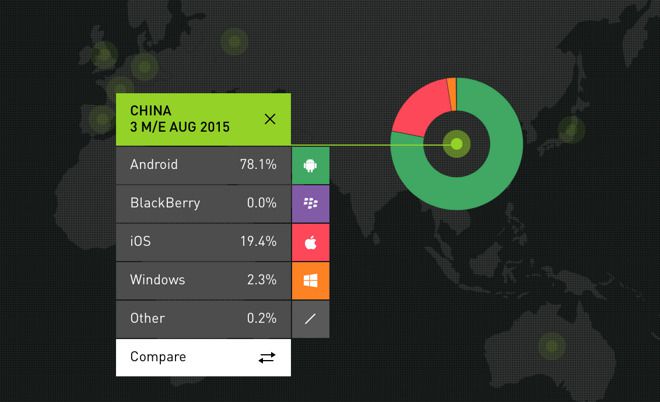 За даними аналітиків Kantar Worldpanel, за підсумками тримісячного звітного періоду, який завершився в серпні 2015 року, частка iOS в Китаї, Великобританії, Німеччини, Франції, Австралії та Японії в порівнянні з аналогічним періодом минулого року зросла. В цей же час частка Android скоротилася.