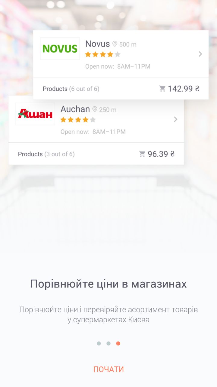 Для взаємодії з додатком, необхідно заповнити перелік продуктів, після підрахування загальної суми, програма порівняє ціни в супермаркетах. Наразі, ця функція доступна для Києва та таких великих мереж як Ашан, Фуршет, Novus, МегаМаркет, Fozzy. Зараз ведуться переговори з представниками інших мереж, тож вже скоро цей перелік поповниться.