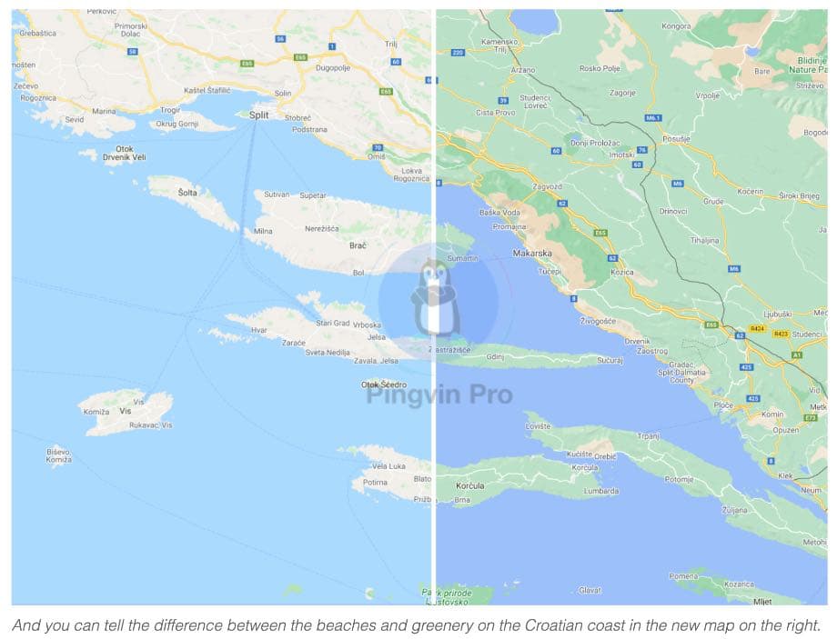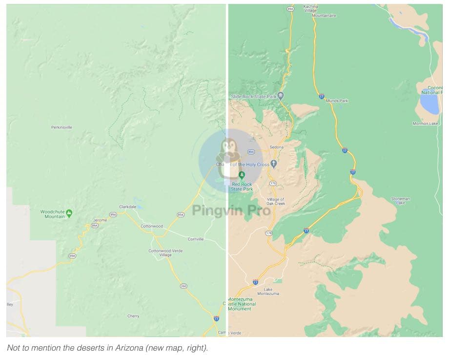 Google заявляє, що використовував супутникові знімки для основи своїх видозмінених карт і що до них був застосований «новий алгоритм колірного картування». Кінцевий результат набагато краще демонструє відмінності між природними особливостями, як-от снігові вершини і густі ліси або зелені поля і піщані пляжі. Наведені нижче порівняльні знімки дають уявлення про те, на що здатна нова техніка колірного картування.