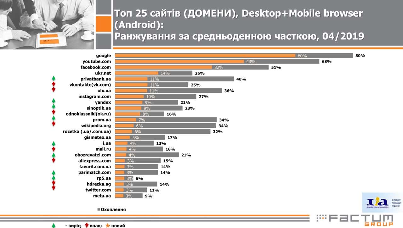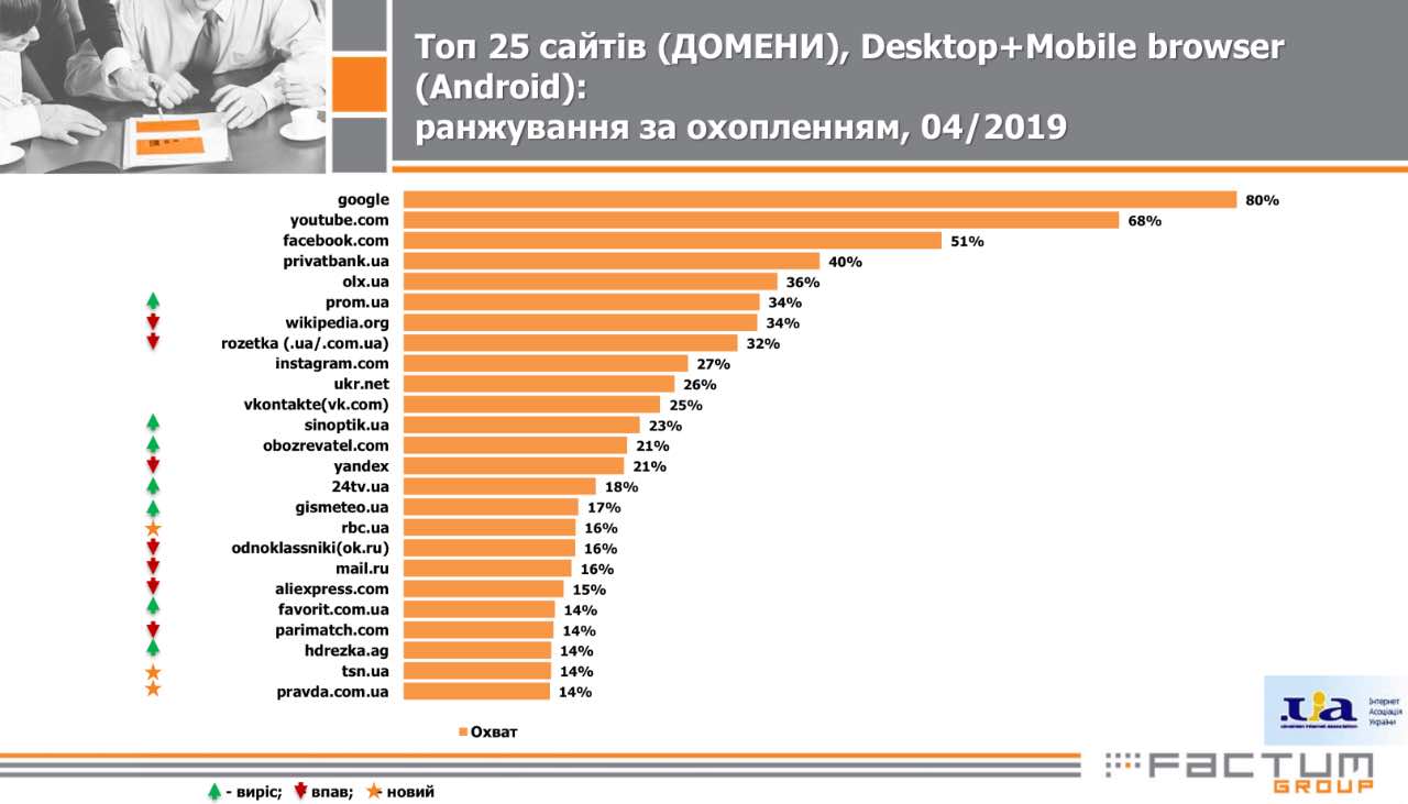 Дослідницька компанія Factum Group Ukraine опублікувала результати дослідження інтернет-аудиторії України за квітень 2019 року. Було визначено перелік найпопулярніших доменів серед українців на базі медіапанелі з 5 тис осіб.
