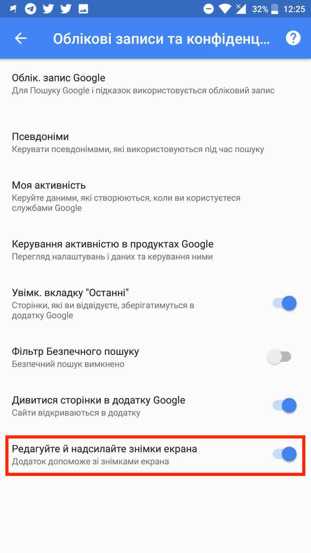 Для початку, перевірте версію свого додатку. Якщо вона підтримує цю функцію, то для її активації необхідно виконати прості дії. Зайти в налаштування – Google – Пошук – Облікові записи та конфіденційність – Редагуйте й надсилайте знімки екрана. Готово! Google сам запропонує вам обрізати необхідний шматок скріншоту в додатку.
