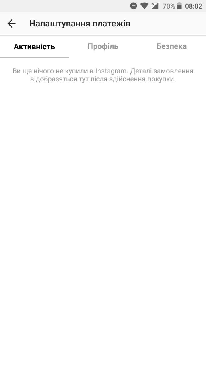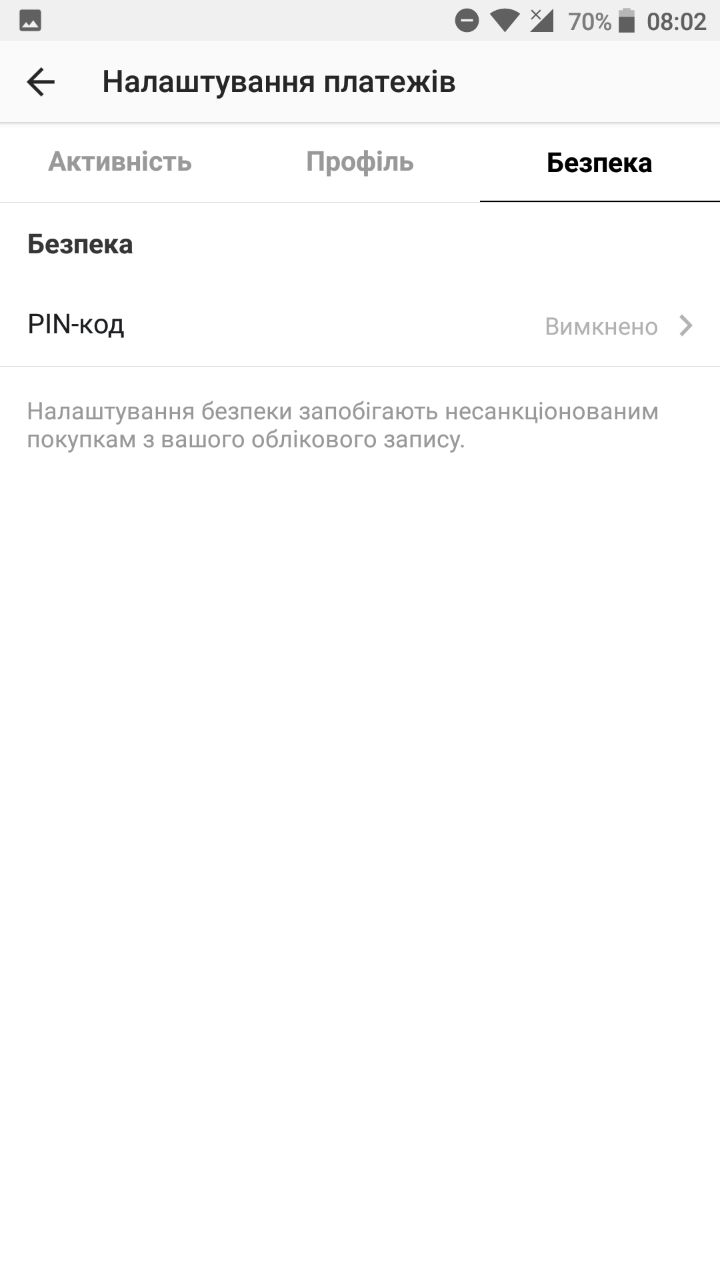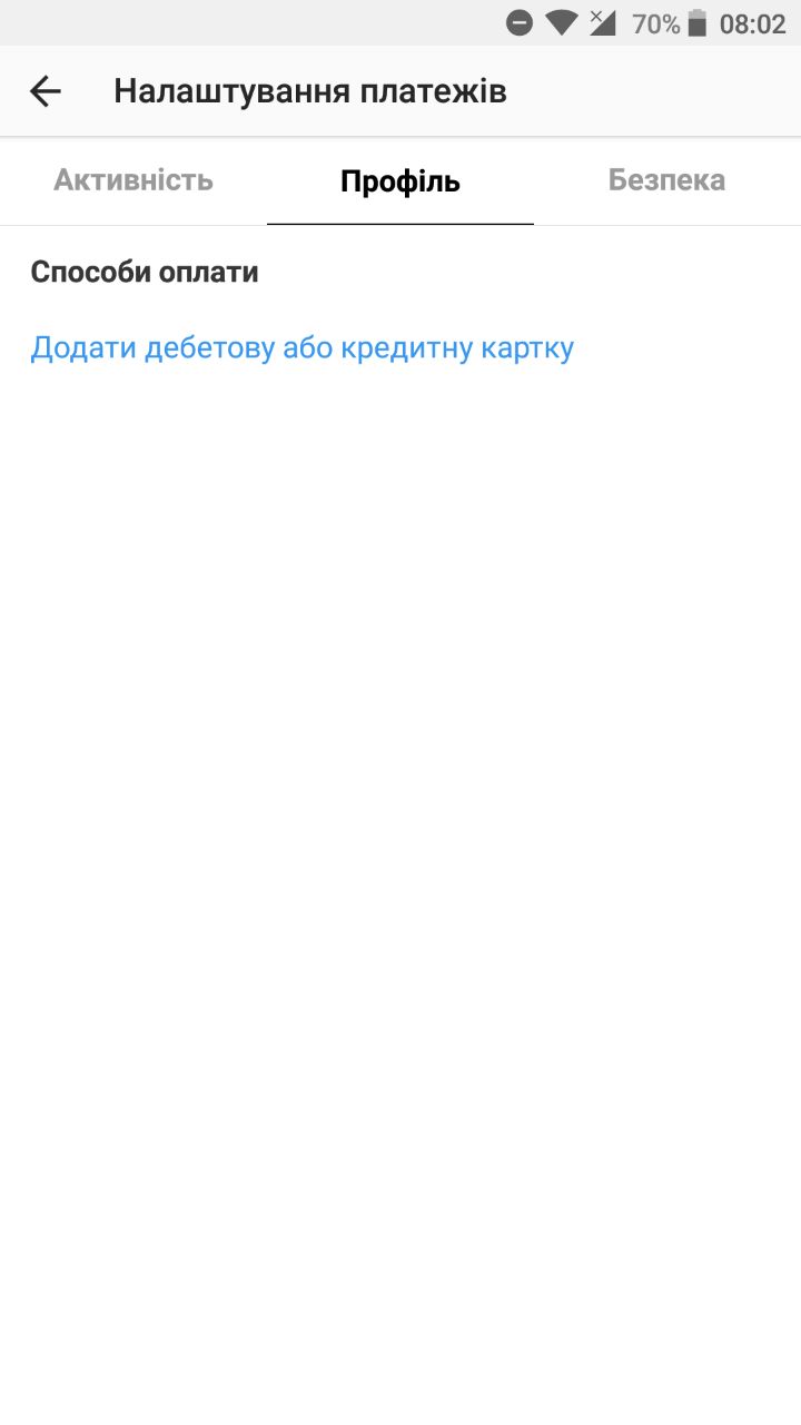 Для того, щоб перевірити чи є у вас ця функція, необхідно зайти в налаштування профілю і знайти в самому низу «Платежі». Перейшовши можна побачити три вкладки – активність, профіль та безпека.