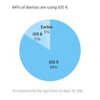 Компанія Apple опублікувала на своєму офіційному сайті для розробників статистику по поширеності версій мобільної платформи iOS. Станом на 18 квітня 2016 року 84% мобільних пристроїв Apple, з яких заходили в онлайн-магазин App Store, працювали під управлінням нової iOS 9. 11 відсотків базуються на iOS 8, а решта 5 відсотків – на більш ранніх версіях мобільної ОС.