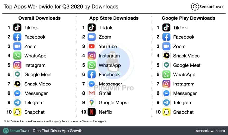 TikTok був найбільш завантаженим на обох платформах, а також вже другий квартал поспіль найприбутковішим неігровим застосунком у світі. Торік, це звання мав Tinder – додаток для знайомств. Як і в минулих кварталах, додатки Facebook, включаючи Instagram і WhatsApp, склали більшу частину п’ятірки неігрових додатків за кількістю світових завантажень, хоча жодна з цих платформ не мала перше місце.