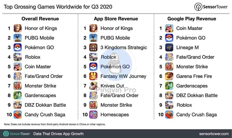 Компанія Tencent посіла першу і другу позиції в п’ятірці найкасовіших ігор у третьому кварталі з «Honor of Kings» і «PUBG Mobile». Разом п’ять найприбутковіших ігор принесли понад $ 2.4 млрд. Кількість встановлених ігор з Apple App Store скоротилася в річному обчисленні з 2.4 млрд до 2.3 млрд. При цьому, переважна більшість завантажень доводилася на Google Play, де зростання склало 36.8%.