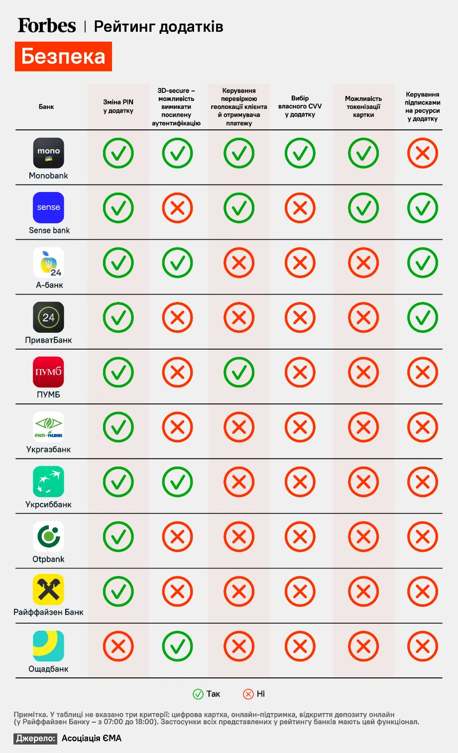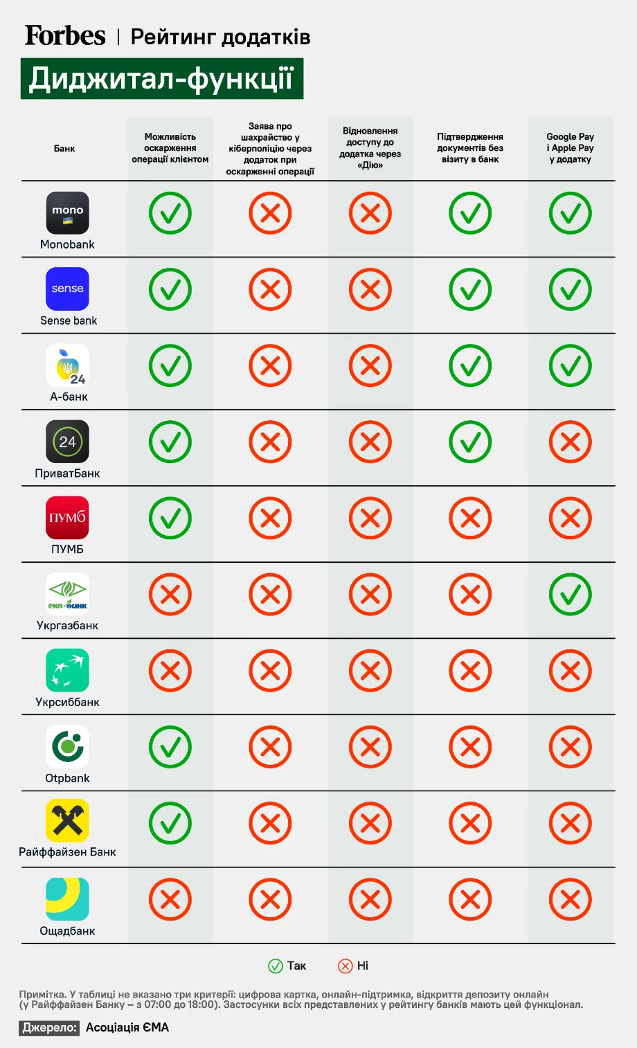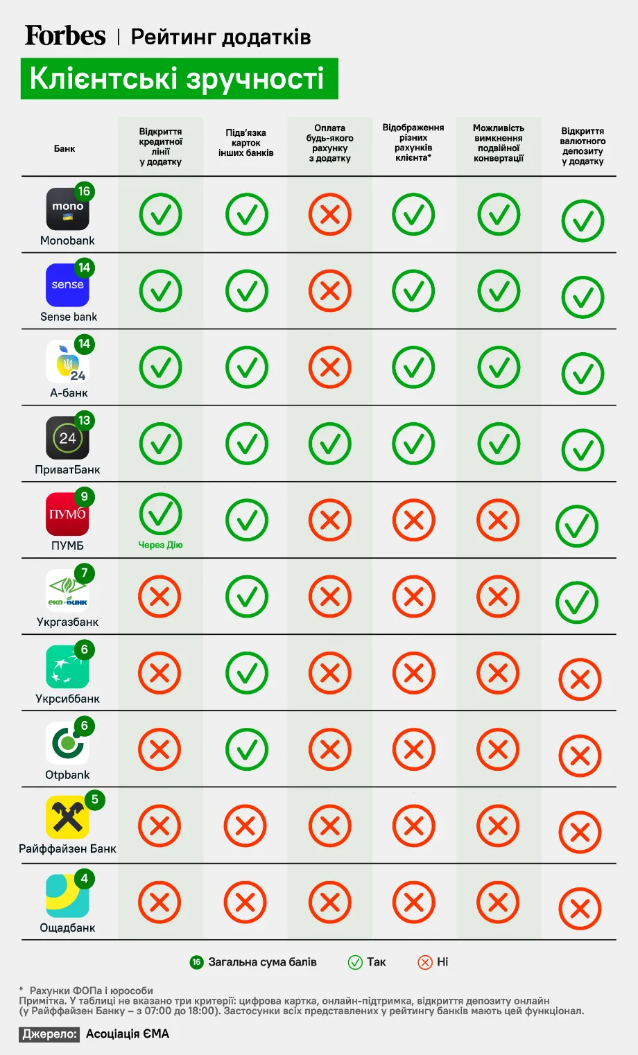 Видання Forbes Україна зібрало дані у зручні інфографіки. Одна функція, за методологією Карпова, дорівнює одному балу. Найбільше набрав застосунок monobank – 17, найменше – Ощадбанк – 4 бали.