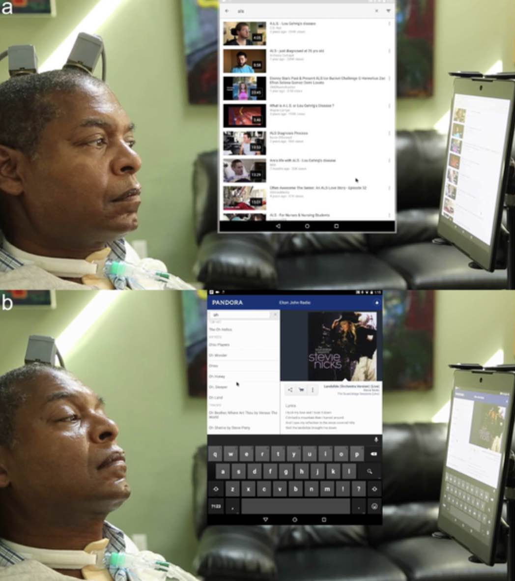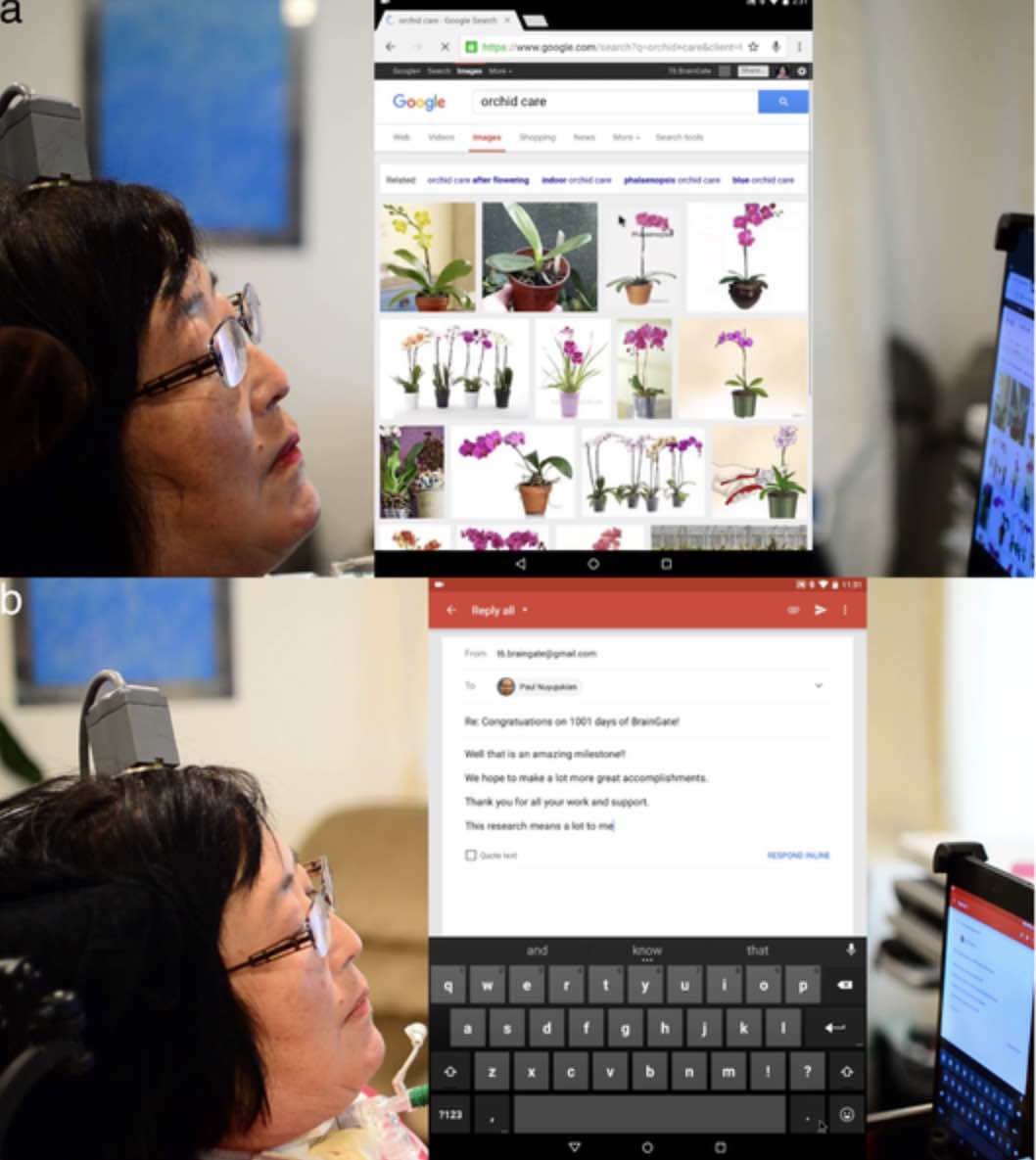 Група вчених на чолі з Джеймі Хендерсоном (Jaimie Henderson), завдяки спеціальному нейроінтерфесу, вирішили навчити паралізованих пацієнтів користуватися планшетом. В дослідженнях взяли участь троє: чоловік і жінка з бічним аміотрофічним склерозом та повною втратою функцій кінцівок, а також чоловік з паралічем, викликаним травмою спинного мозку. Їм, в області моторної кори яка відповідає за рухи робочої руки, вживили мікроелектроди, що зчитували активність головного мозку.