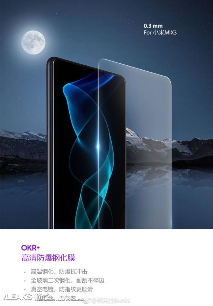Недавно стало відомо, що новий флагман китайської компанії, Xiaomi Mi Mix 3, отримає загартоване та ударостійке захисне скло товщиною всього лиш 0.3 мм. Також, це скло матиме хороше олеофобне покриття. Це дуже тонке скло, тому ми сподіваємося, що цього буде достатньо, щоб пережити різні неприємні ситуації, які в людей бувають навіть дуже часто. Окрім такого тонкого скла, нам стало відомо, що мудрофон також, як і його попередник отримає бездротову зарядку. Фотографії залили через ресурс Slashleaks.