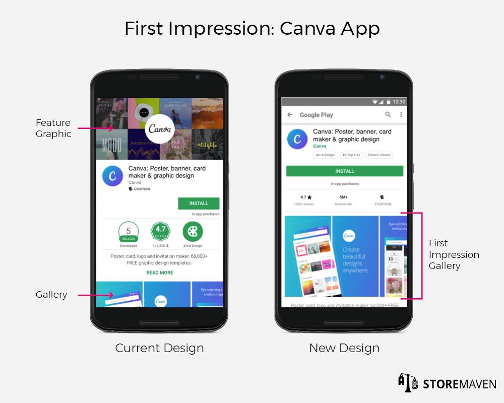 Неозброєним оком стає зрозуміло, що власникам Android готують щось, на кшталт AppStore. На сторінці додатку тепер не буде головної картинки, яка займала пів екрану. Натомість вище підняли галерею знятків. Тепер користувачі стали частіше гортати їх. Піднялися вгору також і відео, які в старому дизайні не дуже полюбляли переглядати. Рейтинг може з’явитися одразу під кнопкою «встановити», аби привернути більше уваги користувачів до додатку.