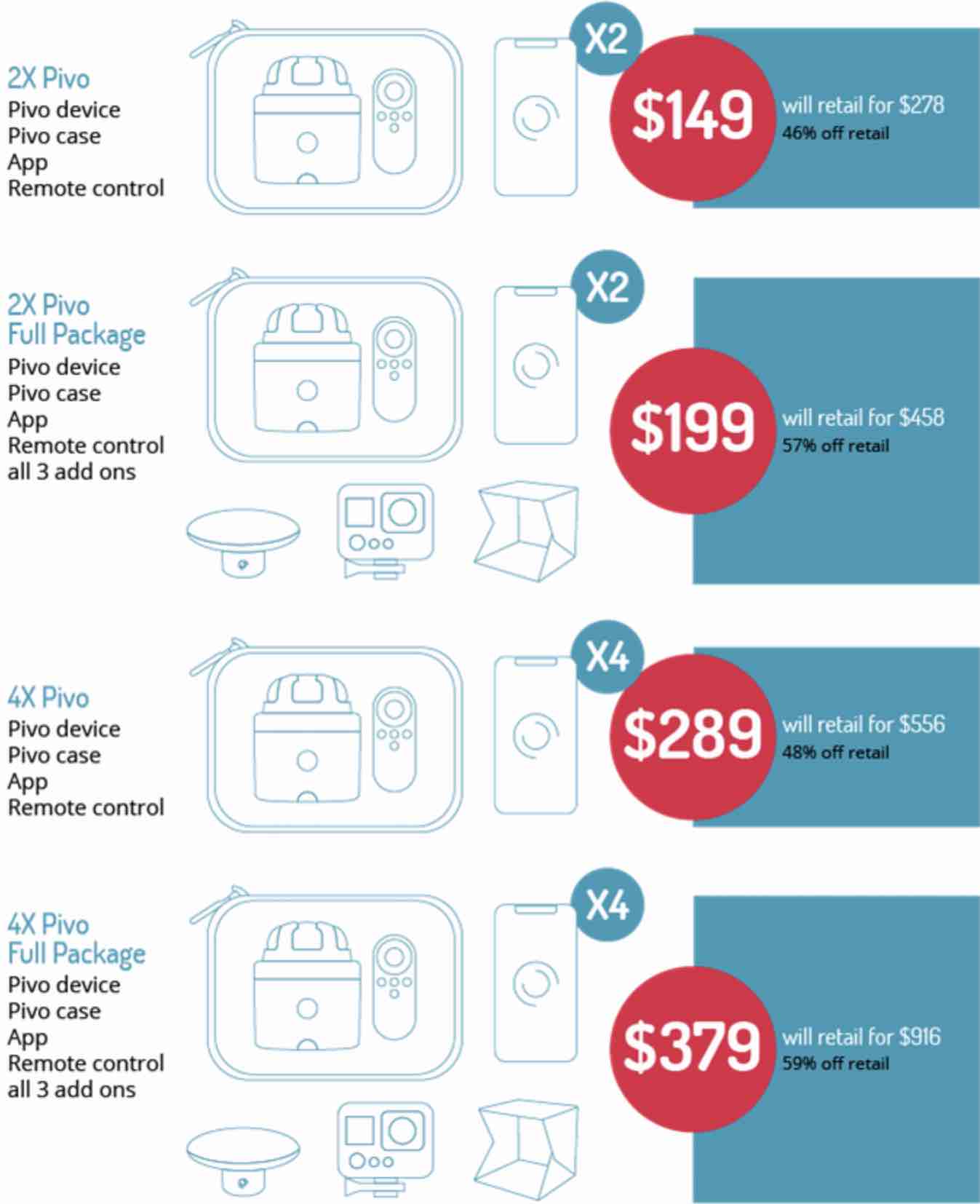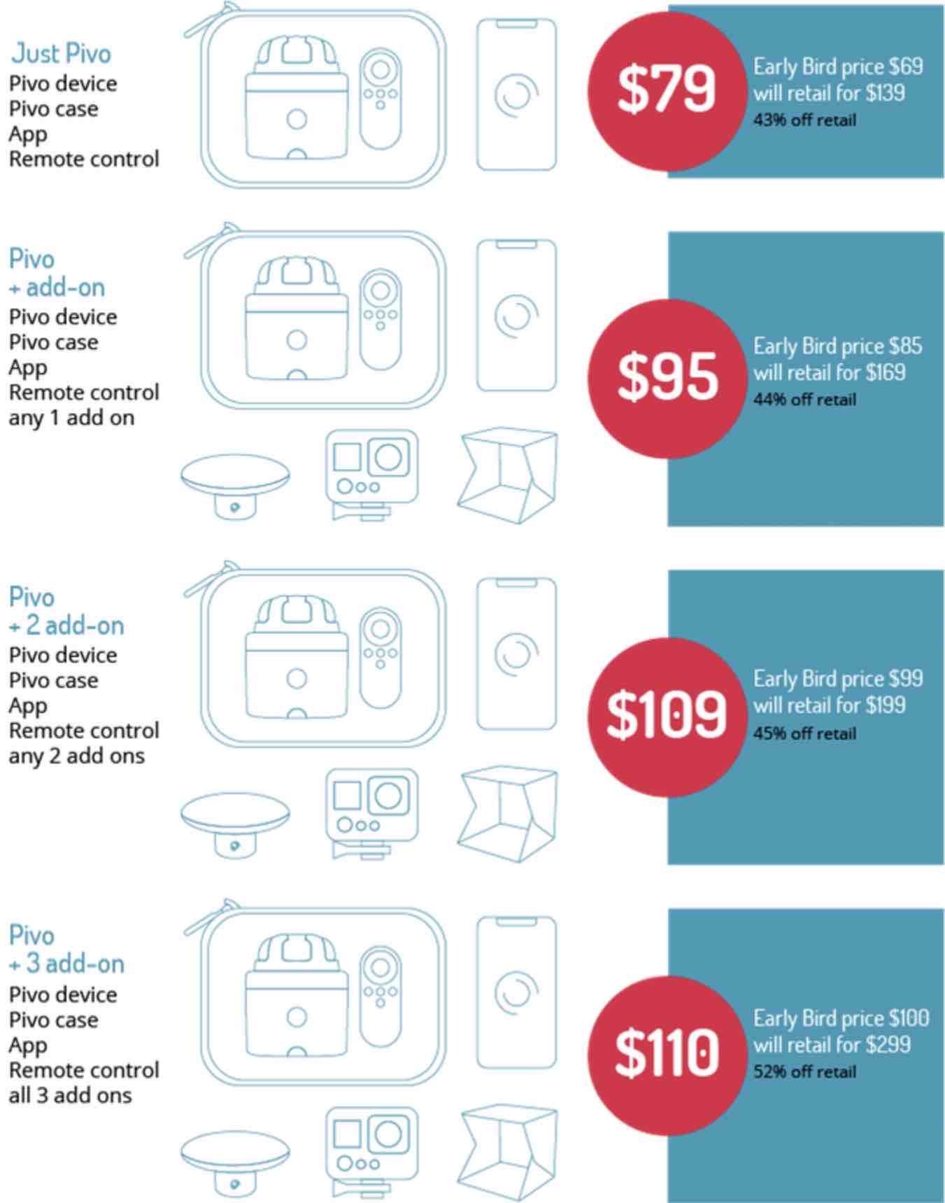 Ціна на пристрій становить від $ 79 (? ? 2 180) до $ 379 (? ? 10 450). Все залежить від комплекту набору. Наприклад, за початкову ціну ви отримаєте підставку Pivo у чохлі, пульт дистанційного керування та застосунок для операційної системи Android або iOS. Пристрій має багато режимів, які допоможуть створити цікавий контент – переходи між ракурсами, відстежування об’єкта в кадрі, уповільнена зйомка тощо.