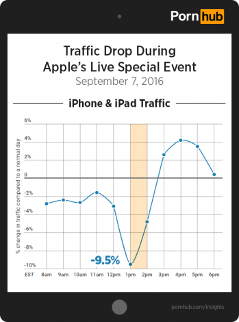 Команда Pornhub проаналізувала трафік, що генерується користувачами iPad та iPhone, а також браузера Safari, включаючи його десктопну версію. Як виявилося, під час прес-конференції Apple, що транслювалася компанією в режимі реального часу, міжнародний трафік з iOS-пристроїв на Pornhub знизився на 9,5%. Аналогічне зниження показав загальний трафік з браузерів Safari – на 8,7%.