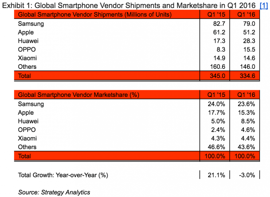 Компанія Samsung лідирує з часткою 23,6%, її поставки досягли 79 мільйонів, що майже на 4 мільйони менше першого кварталу 2015 року. Apple займає друге місце з 15,3% і проданими 51,2 млн iPhone. На третьому місці знаходиться Huawei з 8% і 28,3 млн продажів, на четвертому – Oppo з 5% і 15,5 млн, на п’ятому – Xiaomi з 4% і 14,6 млн.