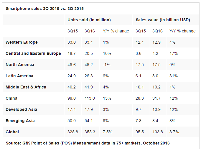 Аналітики GfK в числі інших оцінили ринок смартфонів за підсумками третього кварталу поточного року. Тільки в даному випадку розглядалося розподіл не по виробникам, а по регіонах продажів. Джерело підрахувало, що за минулу чверть в світі було реалізовано 353,3 млн смартфонів, що на 7,5% більше, ніж роком раніше. При цьому в грошовому вираженні ринок виріс навіть сильніше: на 8,7%.