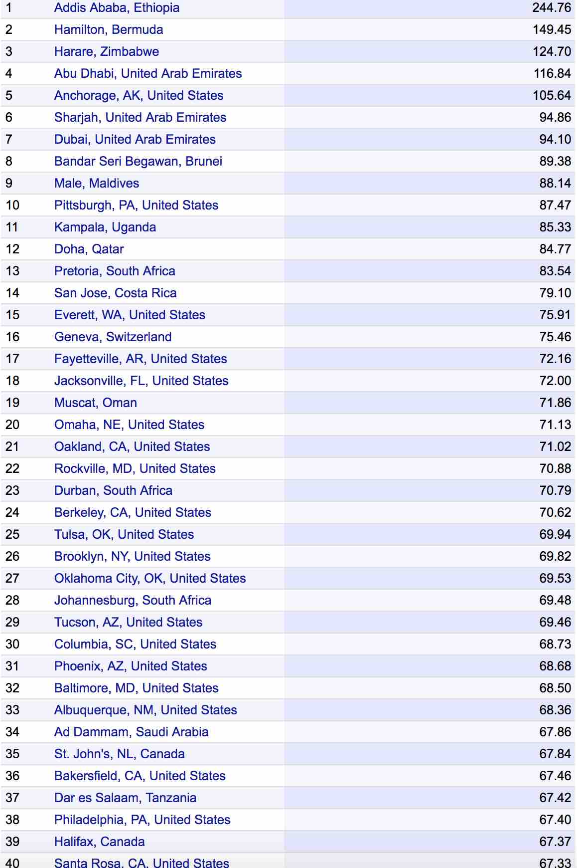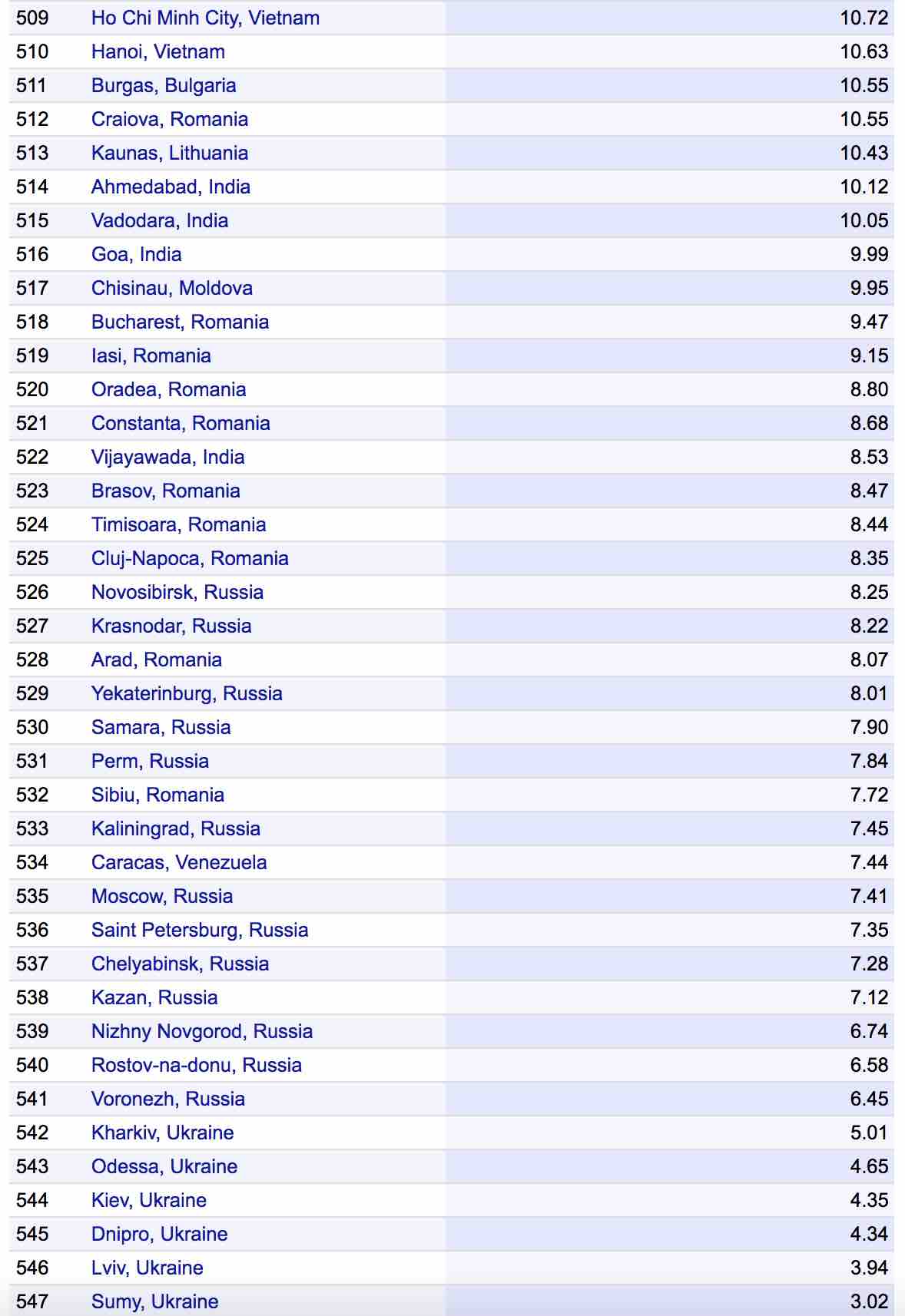 Ось так виглядає перші 40 місць, де найдорожчий інтернет у світі та останні міста з найприйнятнішими цінами. Ціни вказані у доларах. Весь рейтинг можна переглянути за посиланням. Там можна встановити інші валюти для порівняння, наприклад переглянути ціни у гривнях.