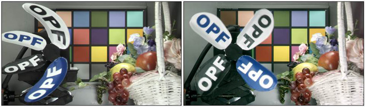 Використання цієї технології дозволило в принципі усунути спотворення, що виникають при зйомці руху датчиком з порядковим переносом. На ілюстрації зліва наведено зображення з рухомим об’єктом (лопаті вентилятора), отримане звичайним датчиком CMOS з порядковим переносом, а праворуч – датчиком зображення OPF CMOS з центральним затвором.