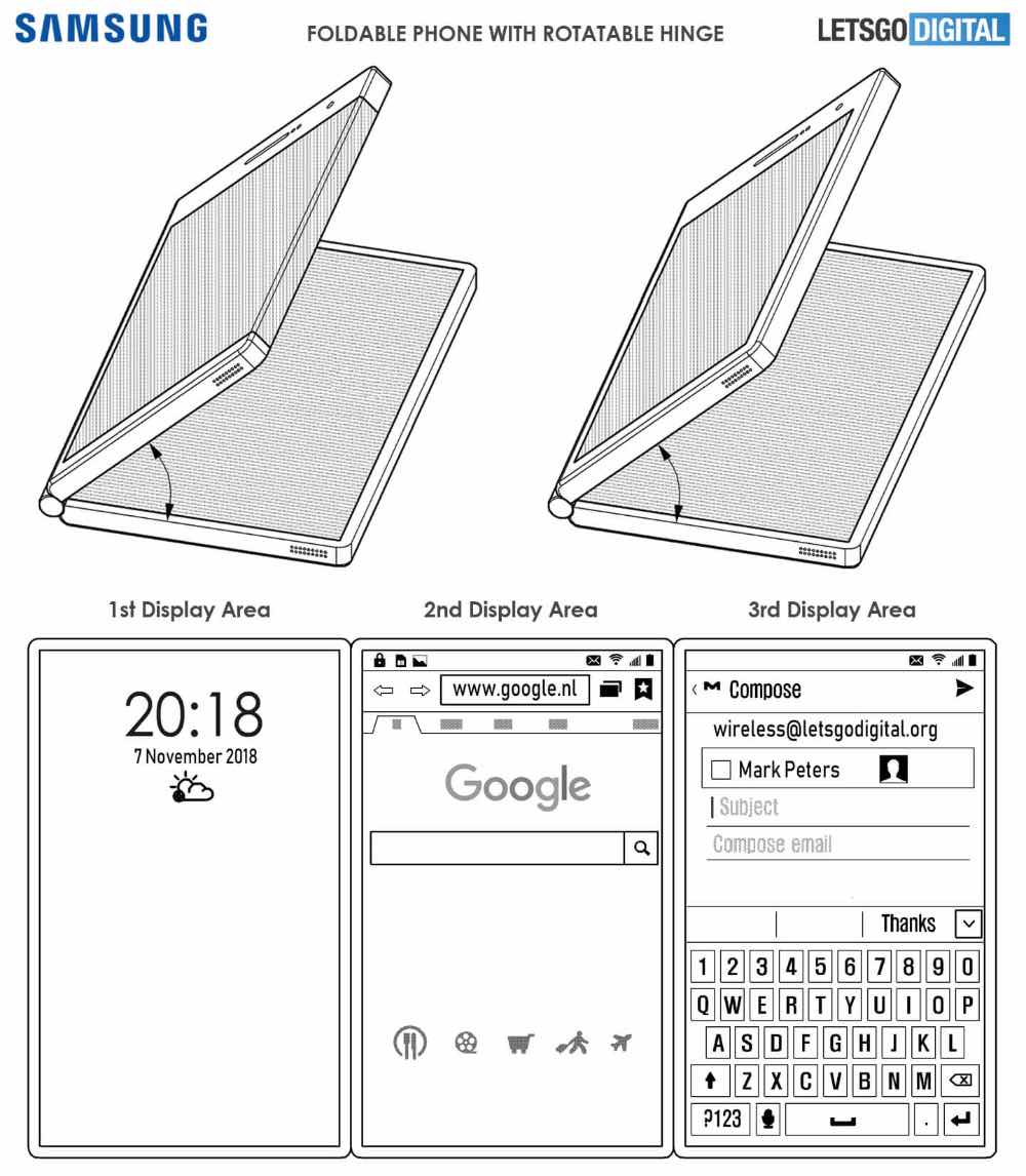 На початку минулого року, Samsung Electronics подавала патент у Всесвітню організацію інтелектуальної власності, в якому йдеться про пристрій із гнучким екраном та спосіб керування ним. Цей патент був опублікований 7 листопада 2018 року. Відбулося це якраз впродовж Конференції для розробників, на якій компанія показала свій перший прототип.