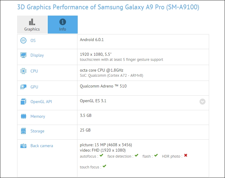 У базі даних бенчмарка GFXBench з’явилася інформація про новий смартфон Galaxy A9 Pro, який компанія Samsung, як очікується, анонсує найближчим часом.