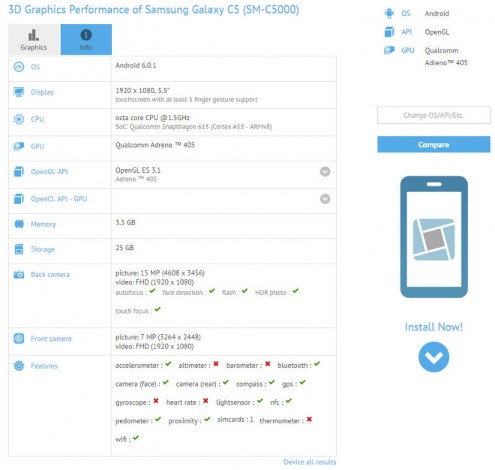 Крім того згідно GFXBench, Samsung Galaxy C5 оснащується 8-ядерний процесором Snapdragon 615 з графікою Adreno 405, 4 ГБ оперативної і 32 ГБ вбудованої флеш-пам’яті, 16 Мп основною і 8 Мп фронтальними камерами. Смартфон працює під управлінням операційної системи Android 6.0.1 Marshmallow.